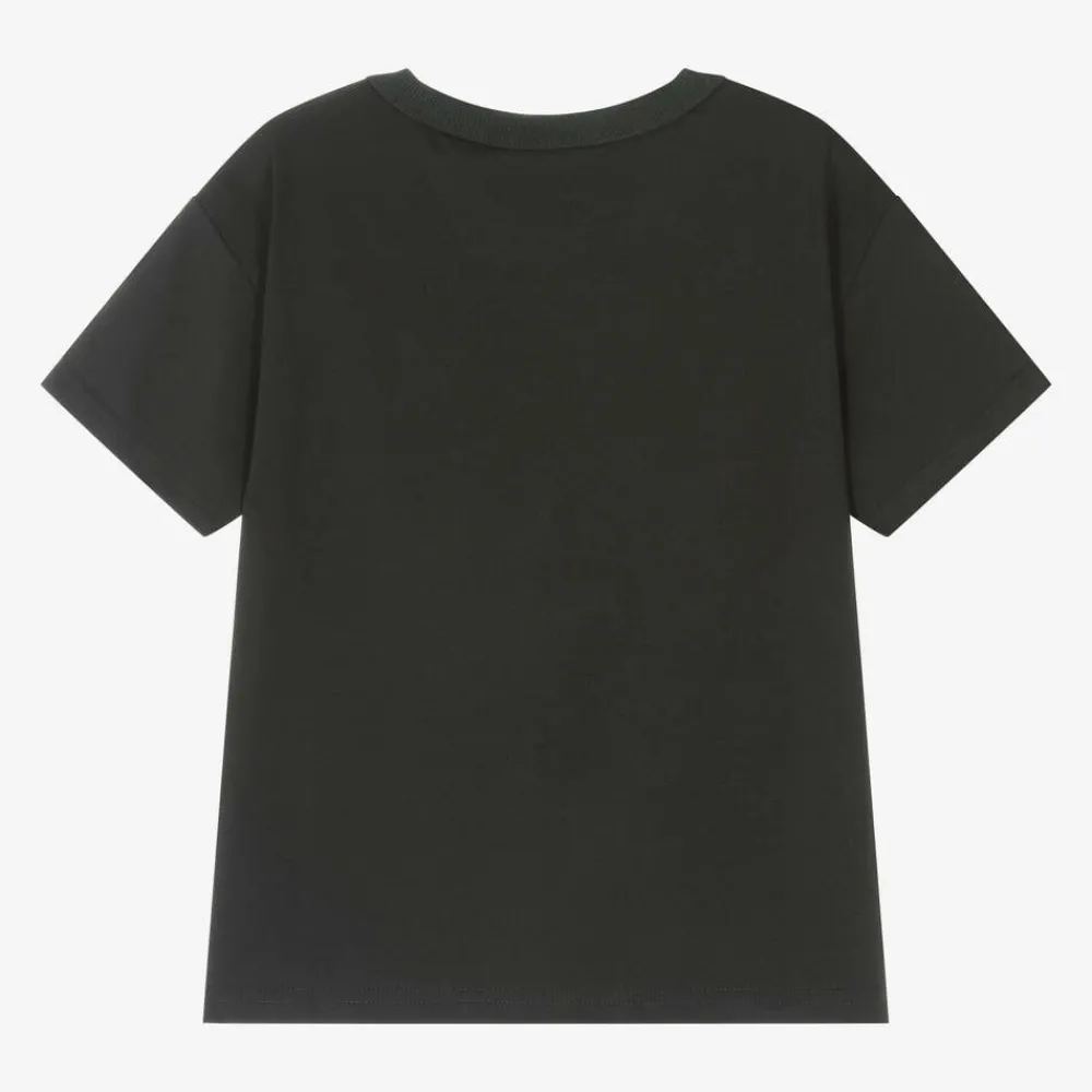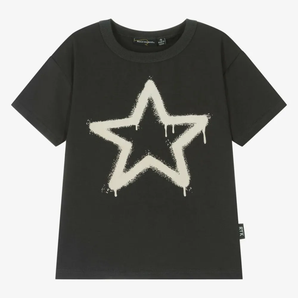 Black T-shirt for boys and girls by Rock Your Baby, made in soft cotton jersey with a washed look. Cool and comfortable, it features an ivory star printed on the front with a graffiti dripping paint effect. This casual tee has short sleeves, a classic ribbed crew neck and a black and white logo tab on one side for a branded finish.
