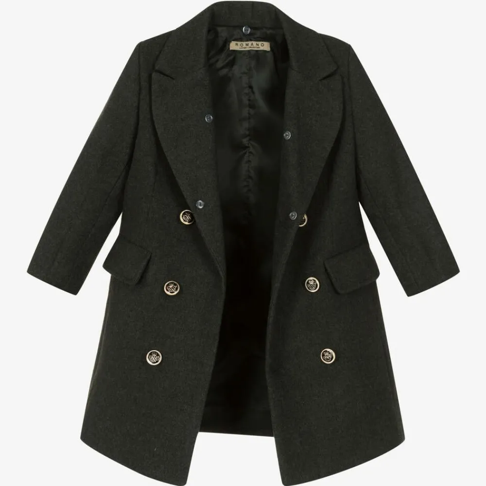 Smart grey coat for boys by British brand Romano. It has a revere collar with an eye-catching, removable, black faux fur trim and black enamelled crest button fastenings with shiny silver detailing. Made in super soft, peached, mid-weight fabric, the coat has front flap pockets and a satin lining. There are faux buttons on the cuffs.