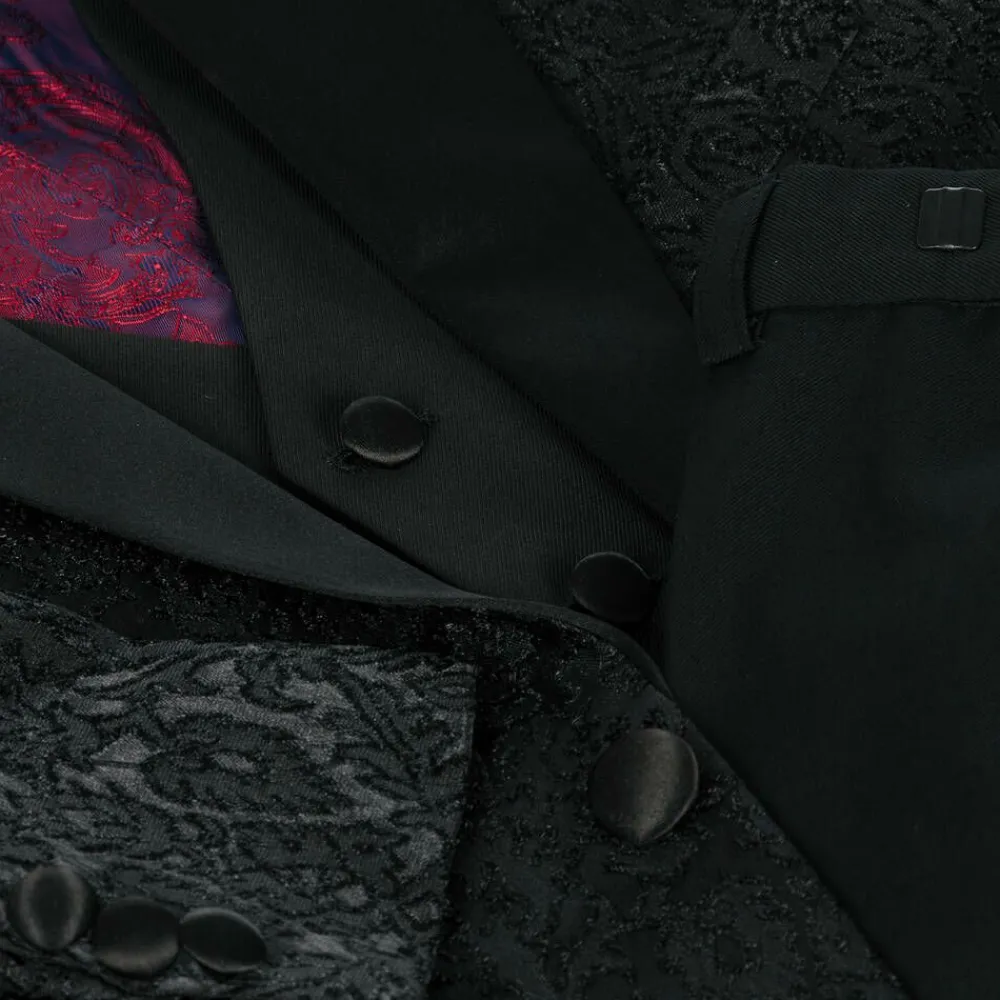 A special occasion suit for boys by Romano. The black jacquard jacket has smart satin lapels and is lined with a sumptuous red and purple damask satin. The waistcoat has a matching damask back with an adjustable strap. Both fasten with satin covered buttons. The black trousers have an adjustable waist for a comfortable fit, with a button, zip, hook and eye fastening.