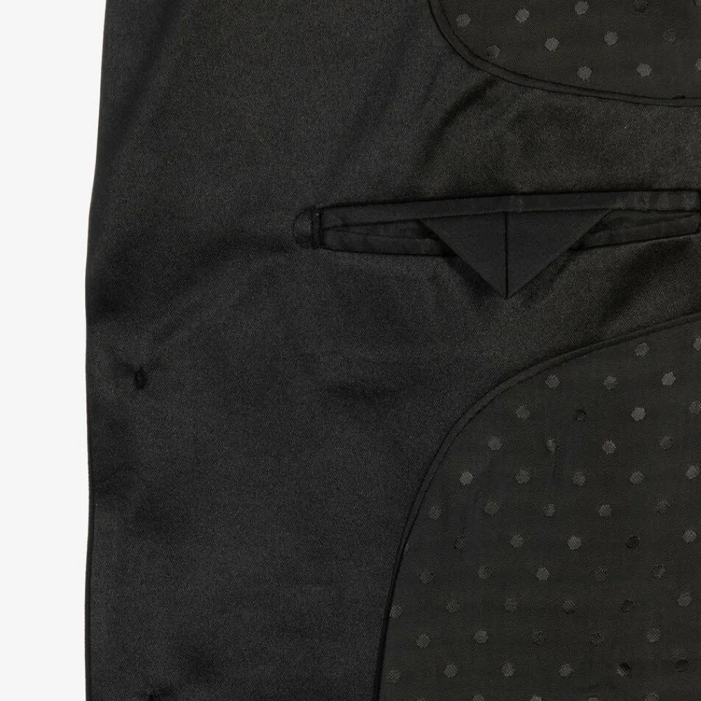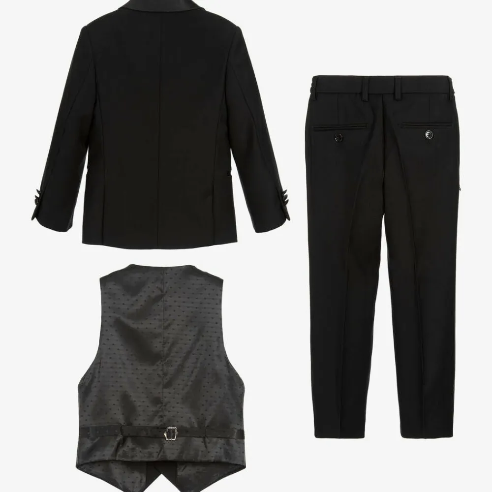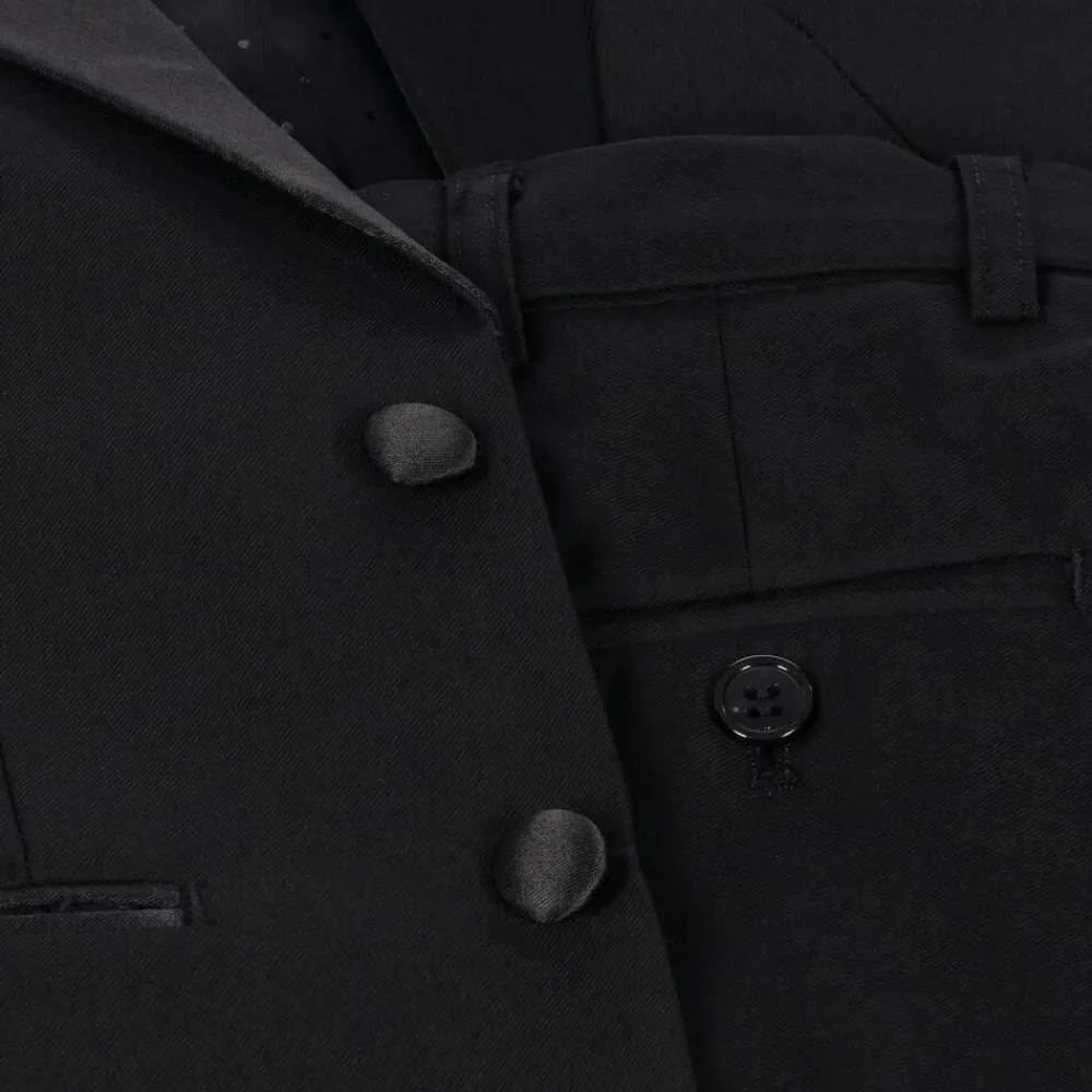 Boys smart black dinner suit from Romano. The suit includes a tuxedo jacket, waistcoat and trousers, with silky satin trims on the jacket. The jacket and the waistcoat have a silky soft lining, and front button fastenings. The trousers have an elasticated waist on the smaller sizes, and an adjustable waist on the larger sizes.