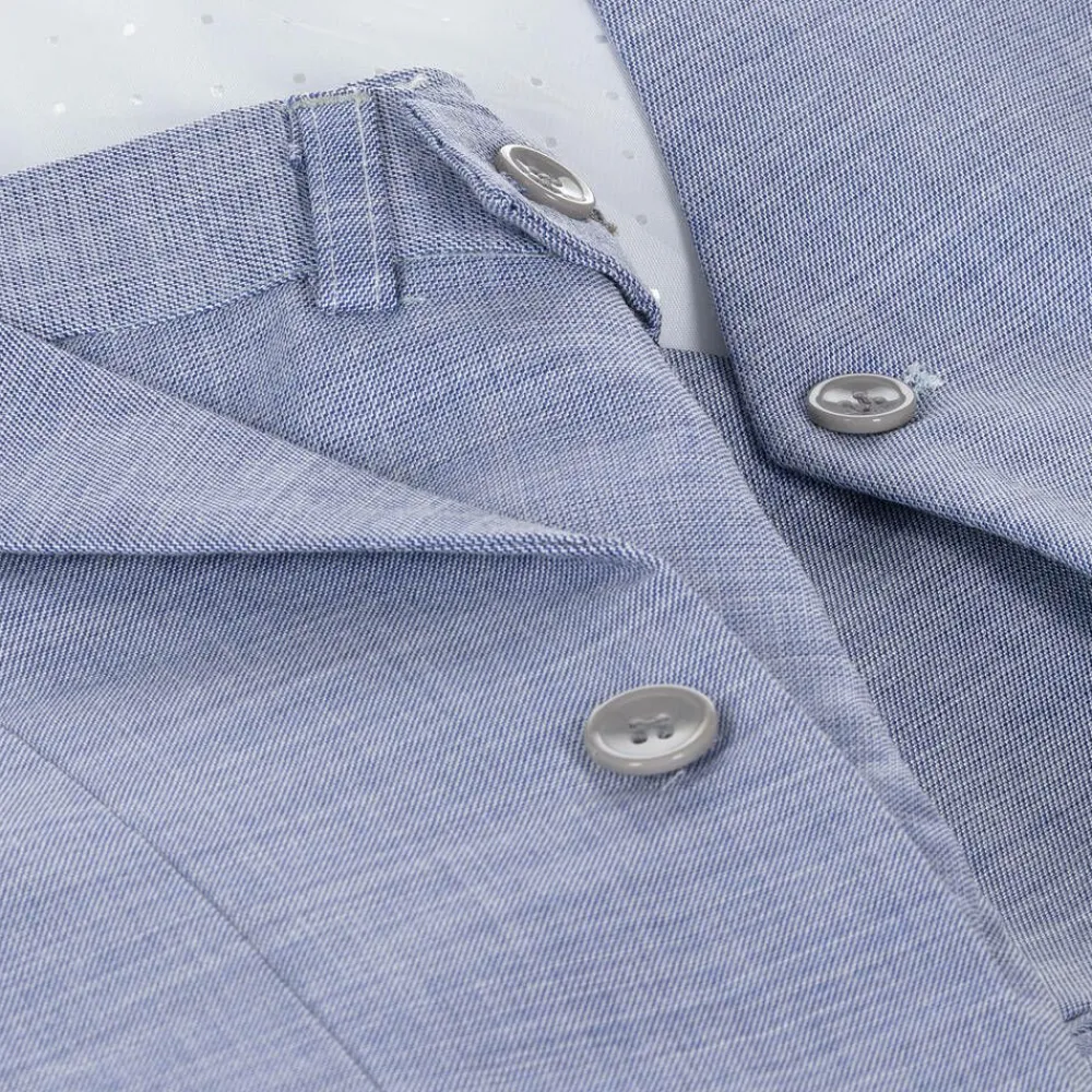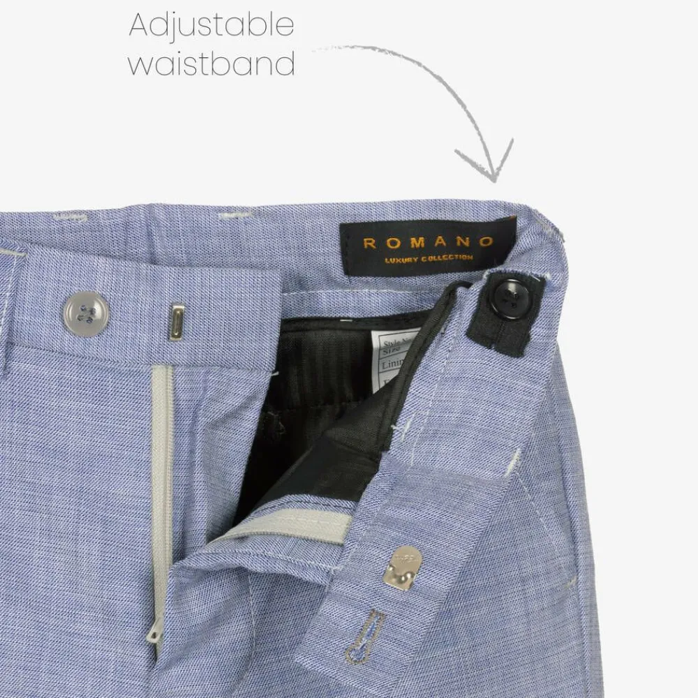 From the Romano luxury collection, a smart blue suit for boys made in soft twill. The blazer has a traditional lapel collar, three front pockets two of which have a flap closure and an internal pocket. The waistcoat has button fastenings on the front and a silky satin back, that matches the blazer lining, for comfort. The waistcoat can be adjusted with a buckle strap on the back for a better fit. To complete the look, the blue trousers have a smart pleat on the front and an adjustable waist for growth.