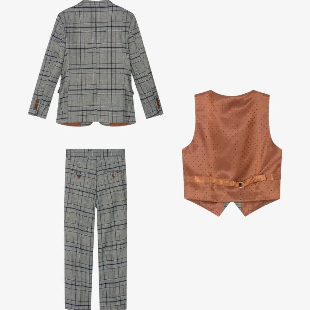 Grey and navy blue suit for boys from British brand Romano. Timelessly smart, all pieces are patterned with check and woven in soft, mid-weight fabric. Traditionally styled, the tailored jacket has brown mock horn buttons, useful front pockets and a comfortably smooth satin lining. In grey check on the front and bronze satin on the back, the waistcoat features front pockets and an adjustable strap on the back for a good fit. The straight-leg trousers have an adjustable waist, pockets and an easy-to-fasten front zip, hook and eye and button for ease of dressing.