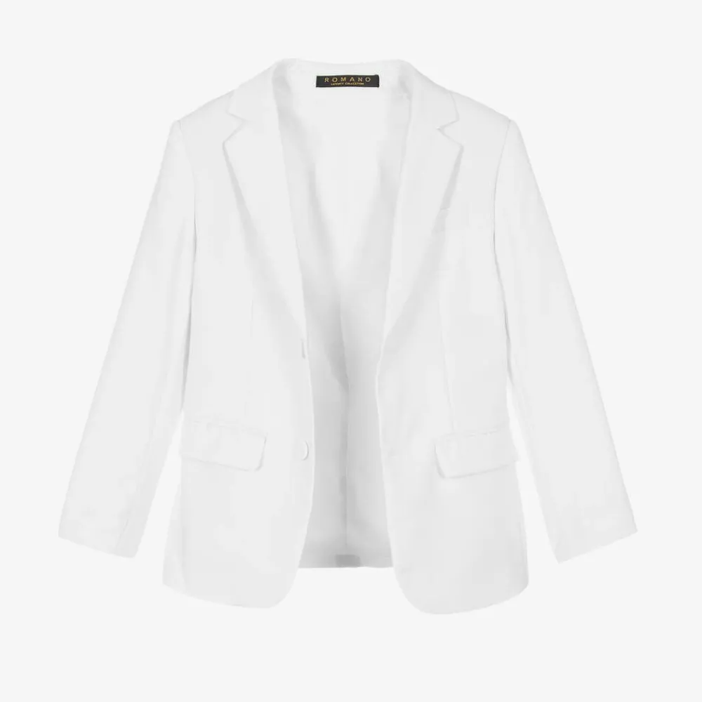 From the luxury collection, a smart white suit for boys by Romano, made from a soft cotton blend twill. Great for special occasions, the blazer jacket has a classic lapel collar, button fastenings, and front pockets with a flap closure. The matching waistcoat has button fastenings on the front and a silky satin panel on the back for a comfortable feel. The adjustable buckle strap on the lower back allows for a great fit. The pair of white twill trousers are fitted with an adjustable waistband and complete the formal look.