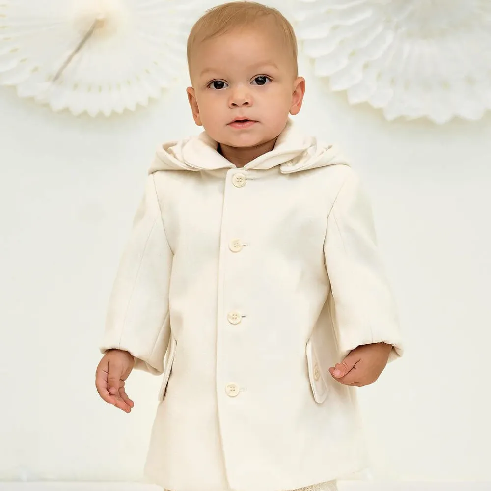 Ivory coat for little boys by British designer Sarah Louise. This traditional design is made in a beautifully soft, brushed viscose blend with smart marbled front button fastenings, a silky-soft lining, and button-closing side pockets. Versatile and classically styled, the hood is removable, attaching with buttons.