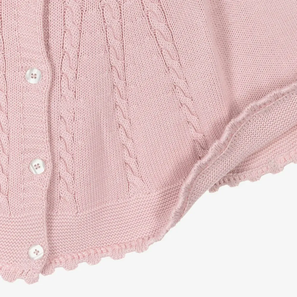 Cosy and warm for little girls, a delightful pink cape by Sarah Louise. Made in a double-layered soft cotton knit, it has classic cable stitch detailing and pretty decorative bows. There is a cosy hood, button fastenings down the front, and poppers to create arm holes.