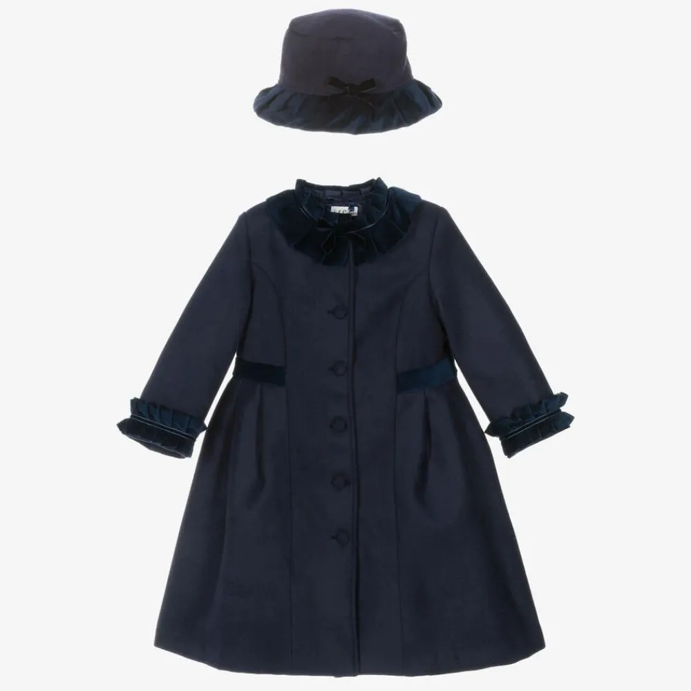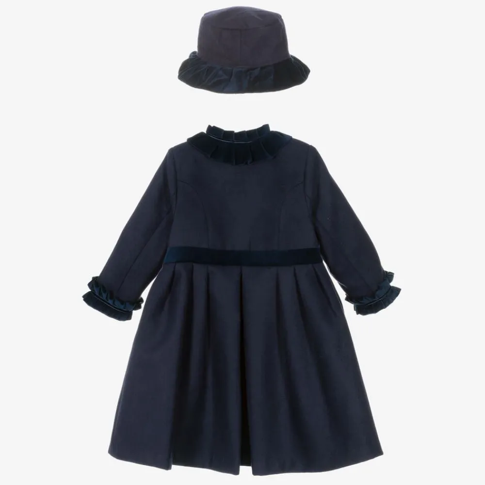 Smart navy blue coat for girls by Sarah Louise, made in a warm, super soft, felted viscose blend. Slightly fitted, with a full, pleated skirt below the navy blue velvet waistband, it has pleated velvet trims and coordinating button fastenings. There is a silky satin lining for comfort. A matching hat completes the set.