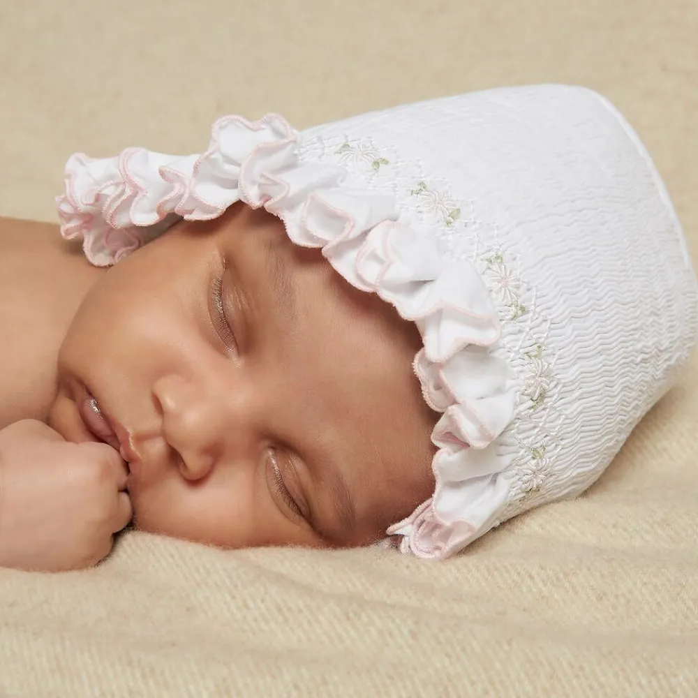 A traditional, hand-smocked white bonnet for baby girls by Sarah Louise. Made and lined in soft polycotton with pink trims and hand-embroidered flowers, it has a silky ribbon to tie under the chin.