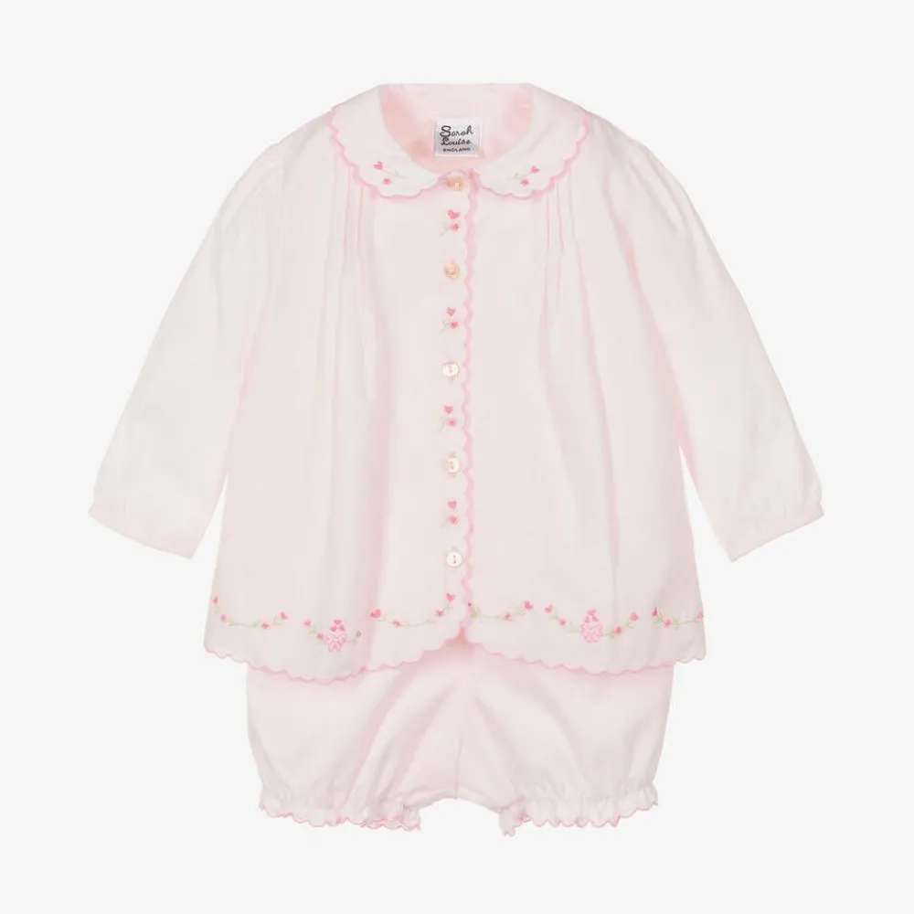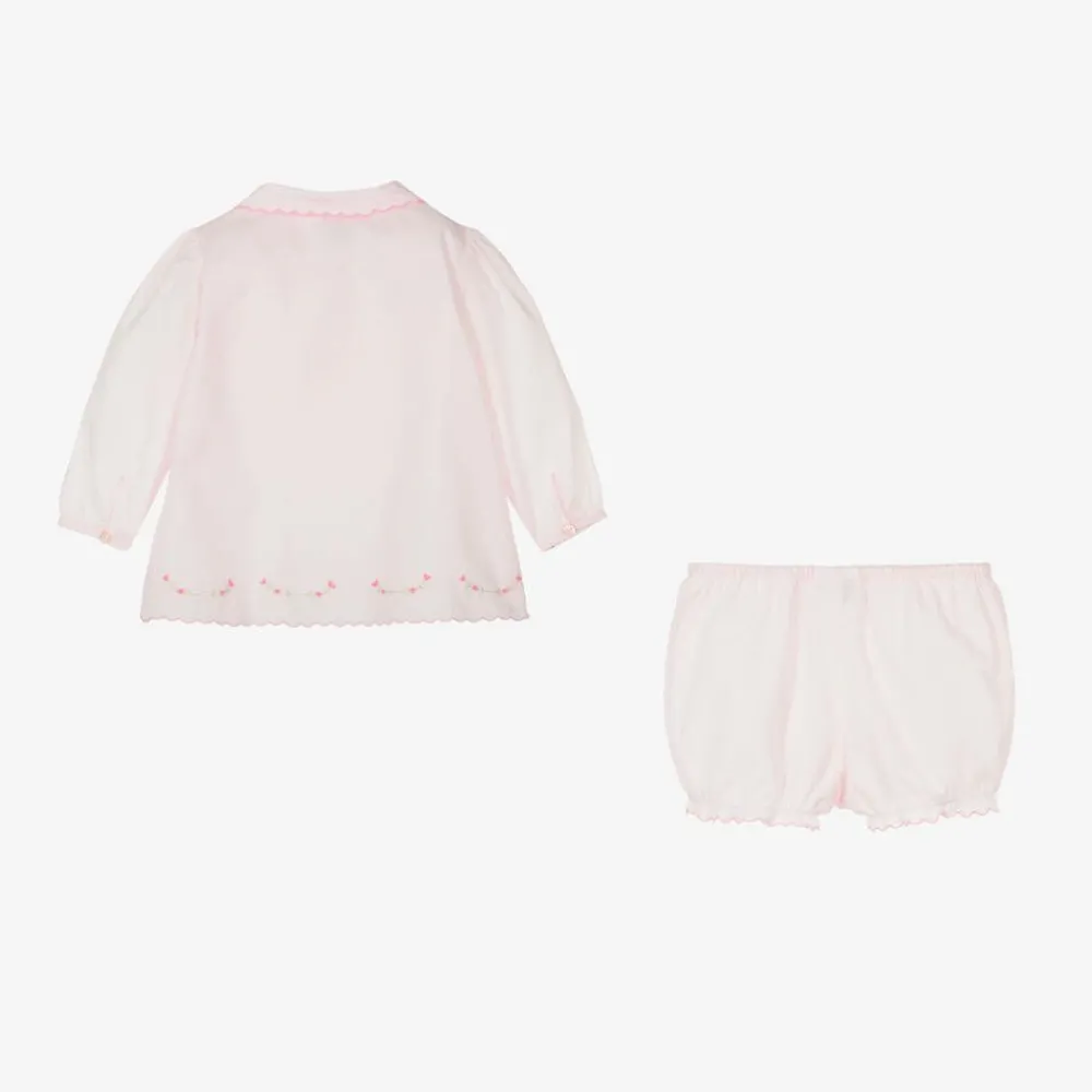A pink shorts set for little girls from Sarah Louise, made in soft cotton blend. The blouse has sweet pink scalloped edges and hand-embroidered pink flowers. It fastens with mother-of-pearl buttons on the front and has front pleats. The matching bloomer shorts are gently elasticated for comfortable wear.