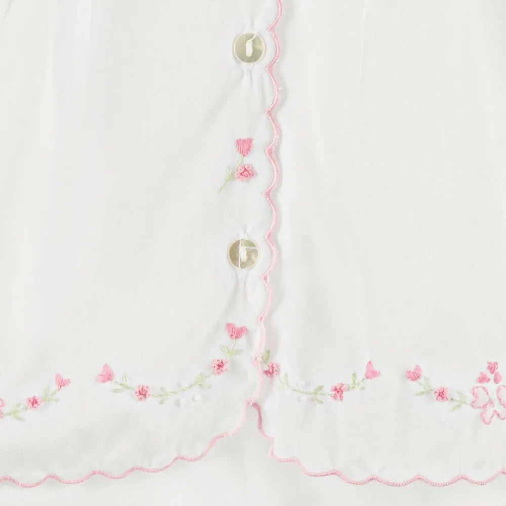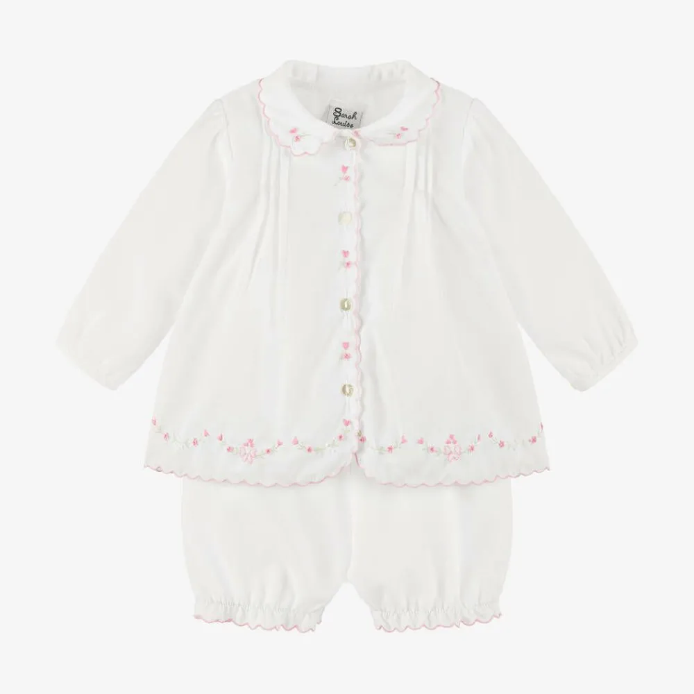 A white shorts set for little girls from Sarah Louise, made in soft polycotton. The blouse has sweet pink scalloped edges and hand-embroidered pink flowers. It fastens with mother-of-pearl buttons on the front and has front pleats. The matching bloomer shorts are gently elasticated for comfortable wear.