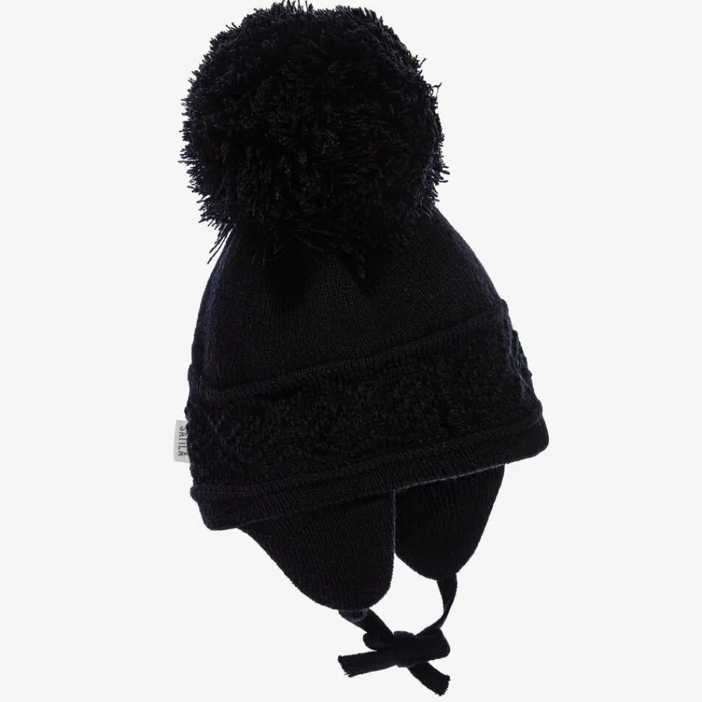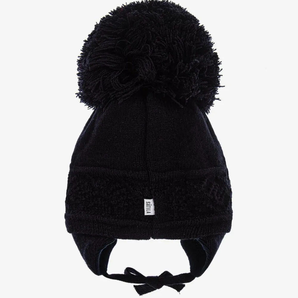 A navy blue beanie for little boys and girls by Sätila of Sweden, in a soft and cosy knit. It has a lovely chunky diamond pattern and a giant pom-pom on the top for a charming look. Shielding them in colder weather, the hat is finished with ear flaps and ties neatly under the chin.