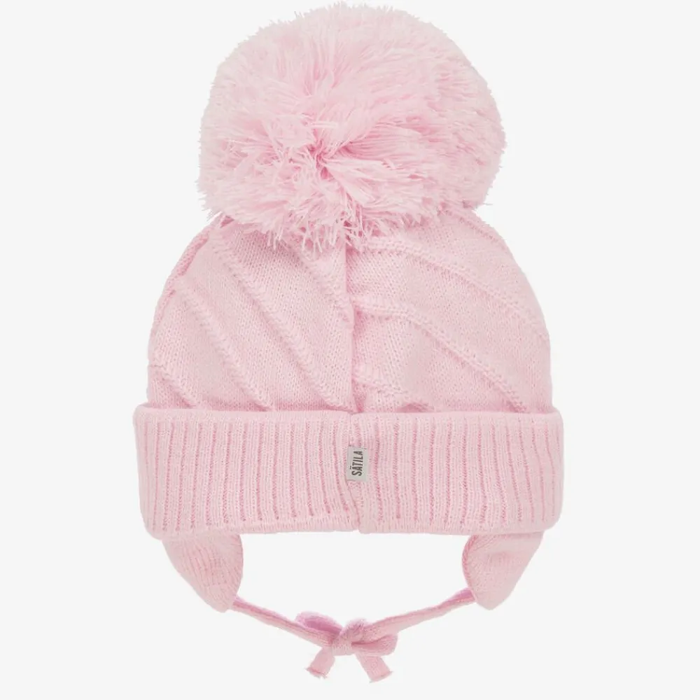 A pale pink winter hat for girls by Sätila of Sweden, made from a chunky knit with diagonal rib detailing. For a cute look, it has a giant pom-pom on top, a turned-up brim, and charming ear flaps with ties that fasten under the chin. It is partially lined in knitted cotton for additional warmth and comfort.