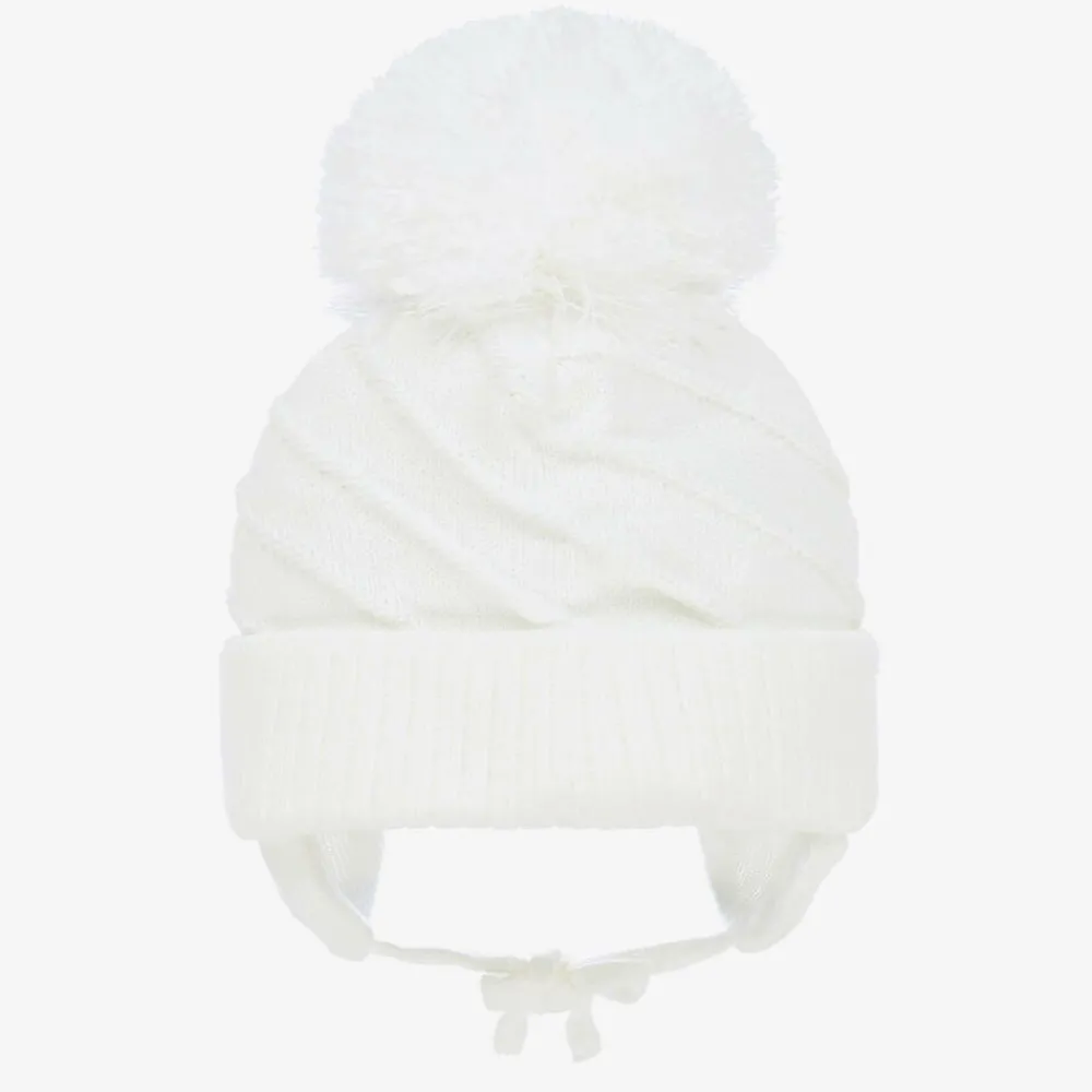 A white winter hat for boys and girls by Sätila of Sweden, made from a chunky knit with diagonal rib detailing. For a cute look, it has a giant pom-pom on top, a turned-up brim, and charming ear flaps with ties that fasten under the chin. It is partially lined in knitted cotton for additional warmth and comfort.