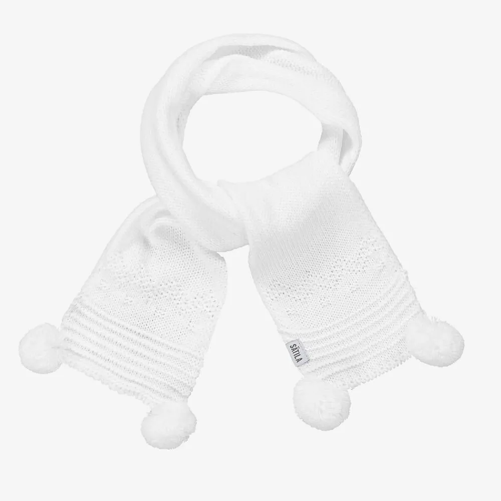 A white knitted scarf for little boys and girls by Sätila of Sweden, decorated with sweet little pom-poms. Cute and cosy, this accessory is designed to keep them warm on cold days.