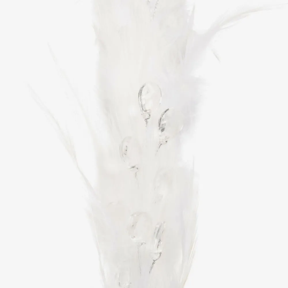 Girls pretty white handmade hairband by Sienna likes to party. The band is covered with white satin ribbon and it has soft white feathers and clear beads.