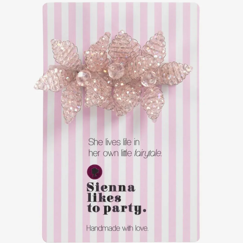 A gorgeous pink hair clip for girls by Sienna likes to party. Tiny crystal beads have been handcrafted to create three sparkly flowers, attached to a satin-covered alligator clip.
