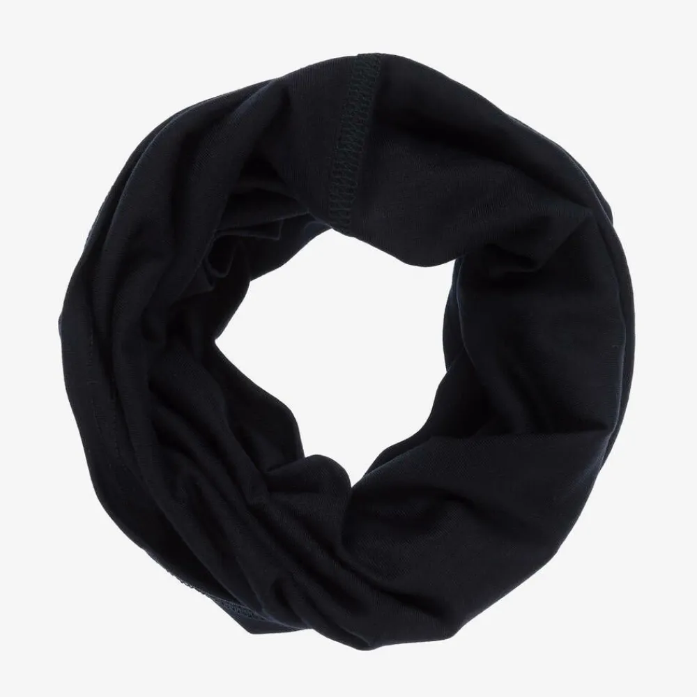 Dark navy blue snood for boys and girls by London-based brand Smalls Merino. Finely knitted in sustainable ZQ Merino wool, this protective accessory is highly breathable, moisture-wicking and suitable for all-year wear. The certified, hypoallergenic fabric is soft and lightweight and ideal for those with skin sensitivities. Easy to wear and extremely versatile, it can be worn as a scarf, headband, hat or face covering.