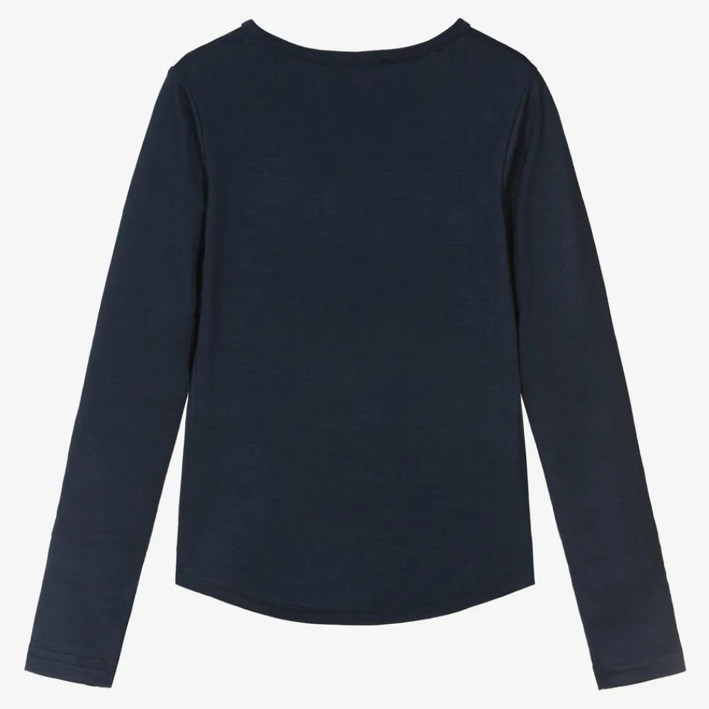 Navy blue top for boys and girls by London-based brand Smalls Merino. Beautifully soft and lightweight, this technical design is finely knitted in sustainable ZQ Merino wool, helping to regulate body temperature and wick moisture away from the skin. Naturally antibacterial and gentle against sensitive skin, this versatile piece can also be worn as a warm base layer or as comfortable loungewear. Longer in the body, it has a curved hem, long sleeves and a tonal logo embroidered on the cuff.