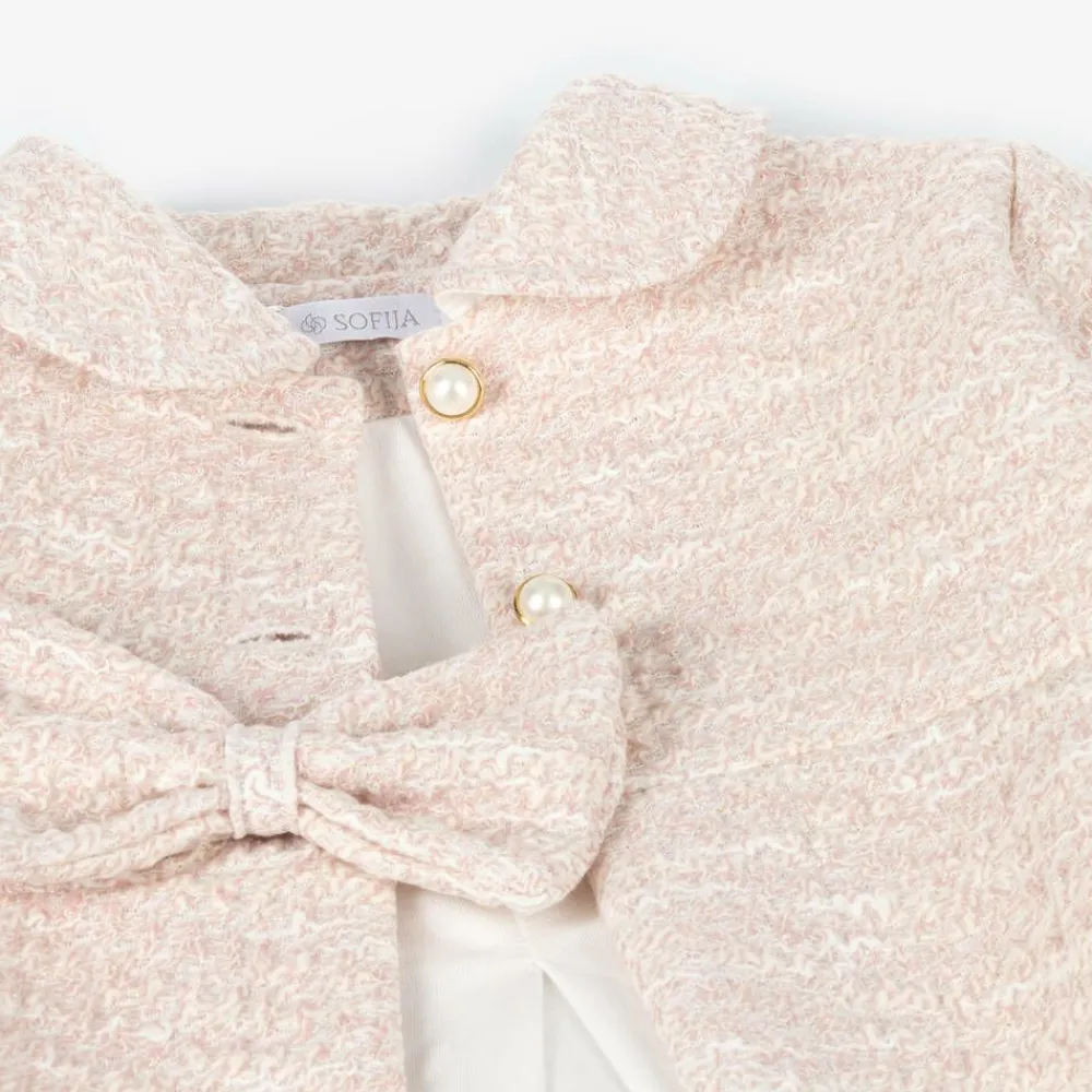 A traditional pale pink coat for younger girls by Sofija, made in tweed-effect cotton with a lovely soft feel. Woven with a glittery gold thread for a subtle shimmer, this classic piece is lined in cotton jersey for comfort. It fastens with faux pearl buttons and has a decorative bow on the front for a pretty finish.