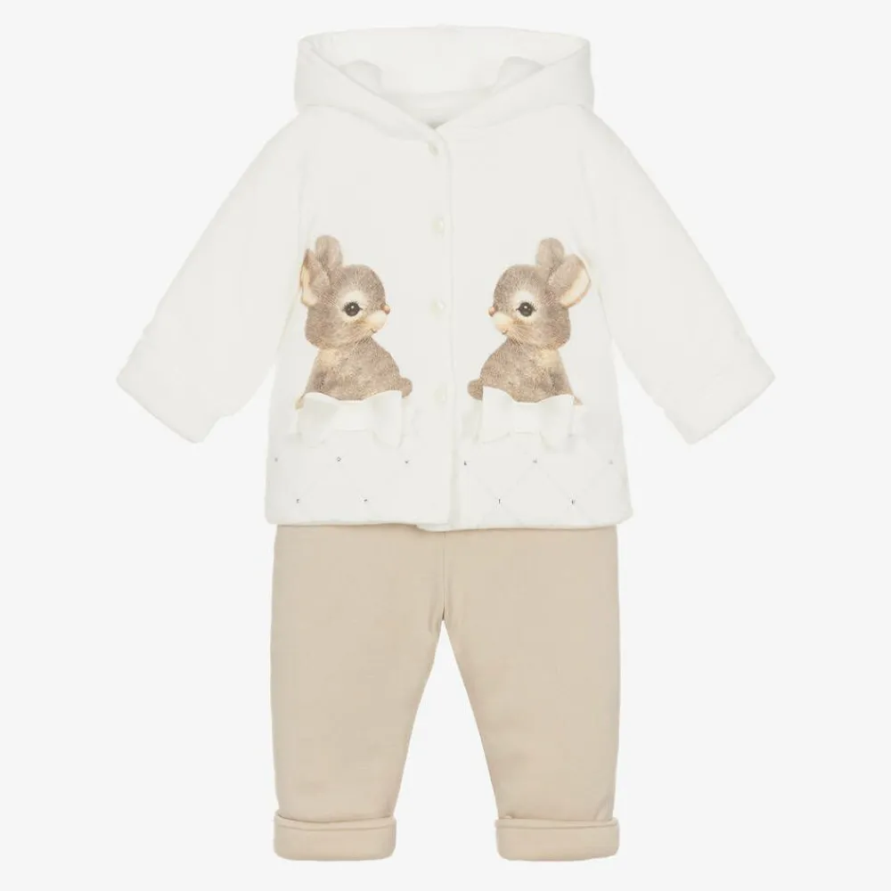 Adorable for baby girls, a soft padded pram coat and trouser set by Sofija, made from soft, mid-weight jersey. The ivory pram coat has a large jersey-lined hood and adorable bunny motifs printed on the front. It also has silky ivory bows and diamanté trims. The matching beige trousers have a soft elasticated waistband for added comfort.
