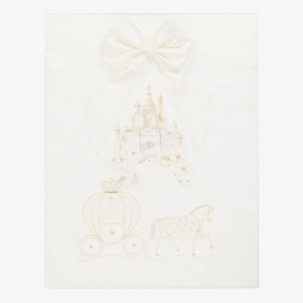Ivory padded blanket for baby girls by Sofija, made in soft cotton jersey. An attractive nursery accessory, it has a beautiful princess castle and flower illustration in beige on the front, together with a satin horse and carriage appliqué, embellished with sparkly diamantés and metallic gold embroidery. It has a silky satin trim at the top, with a gorgeous oversized satin bow to finish.