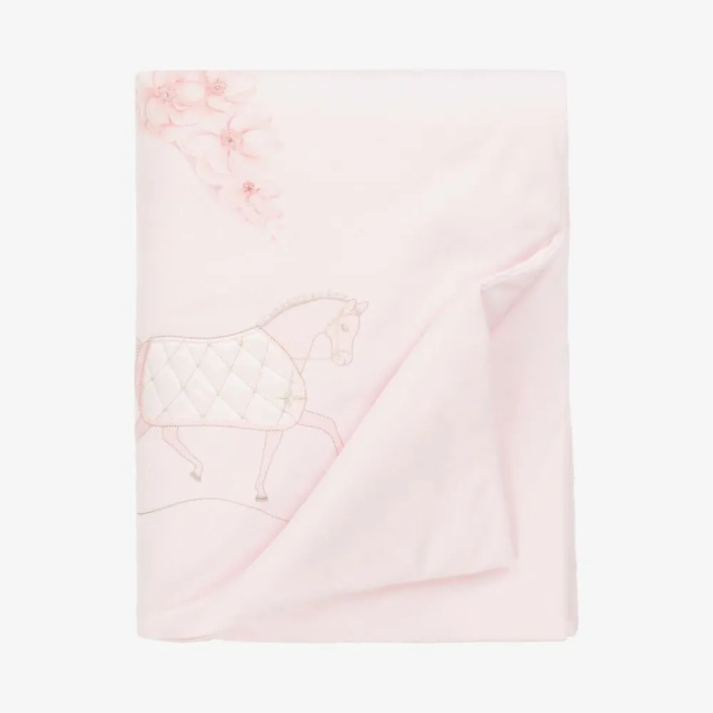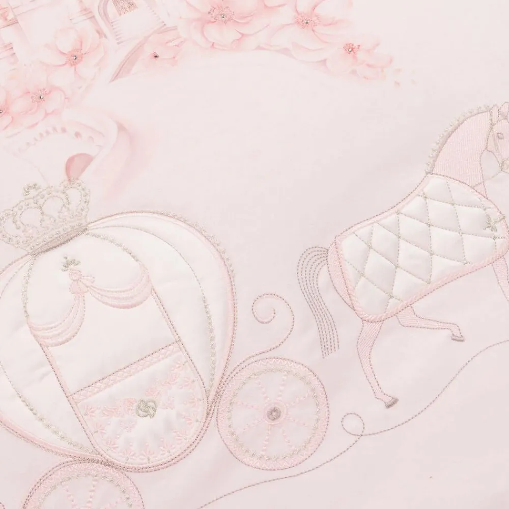 Pink padded blanket for baby girls by Sofija, made in soft cotton jersey. An attractive nursery accessory, it has a beautiful princess castle and flower illustration in pink on the front, together with a satin horse and carriage appliqué, embellished with sparkly diamantés and metallic silver embroidery. It has a silky satin trim at the top, with a gorgeous oversized satin bow to finish.