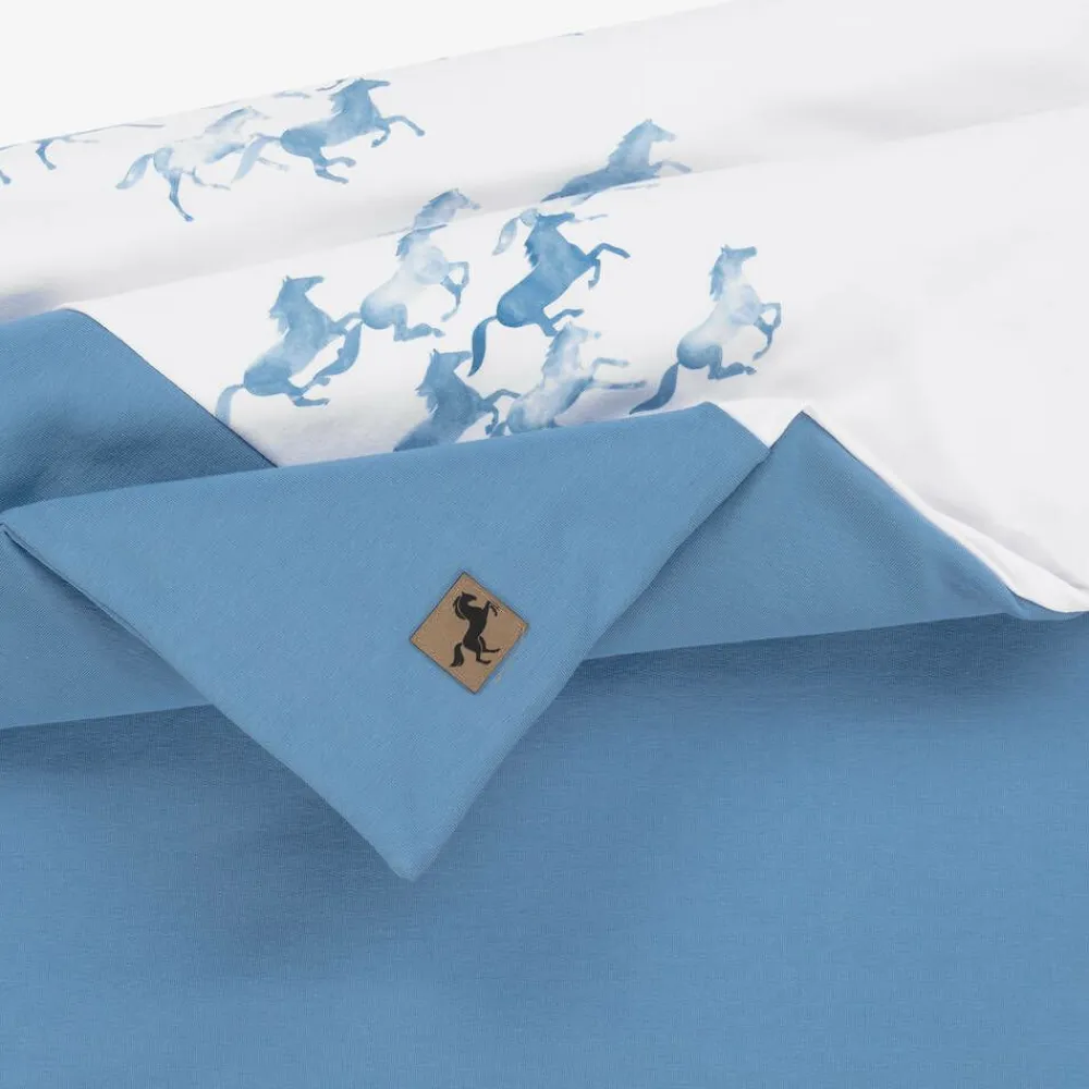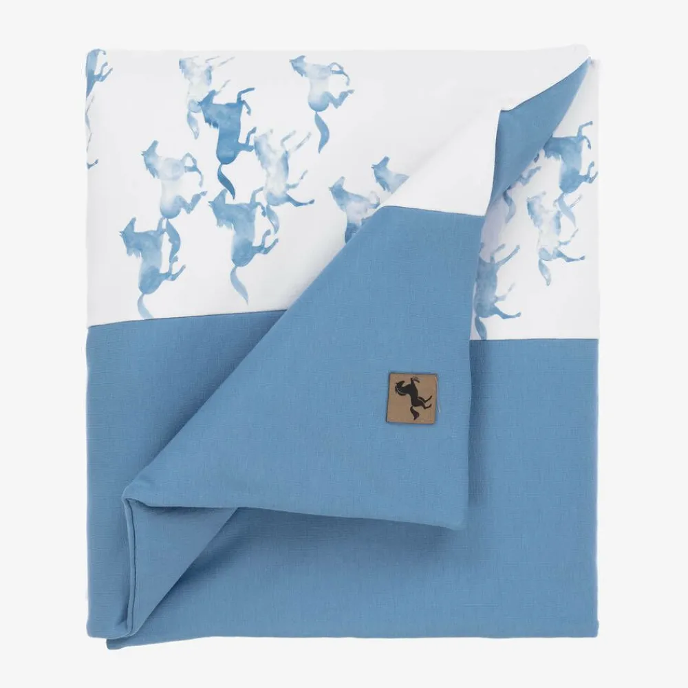 Exclusive to Childrensalon, a lovely blue and white blanket for baby boys by Polish brand Sofija. Made in soft cotton jersey and softly padded, it is patterned in a beautiful blue horse print on the front. An attractive nursey accessory, it also makes a comfortable surface to lay baby.