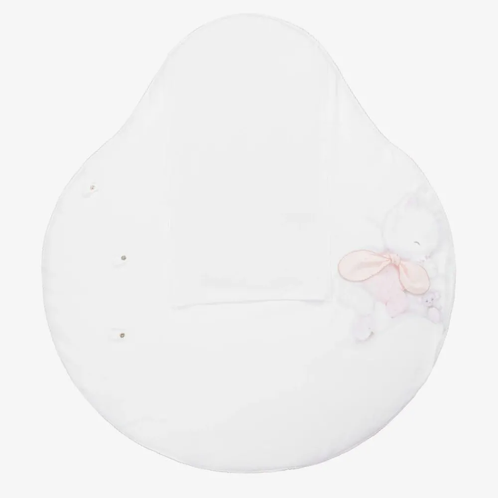 White nest for baby girls by Sofija, exclusive to Childrensalon. Softly padded for comfort, this accessory is made in comfortable cotton jersey for a gentle feel against baby's skin. It has a pale pink lining with glittery silver stars and an adorable kitten print on the front. The knotted bow appliqué and the delicate beige picot trims add lovely finishing details. The nest has a removable coir mat, allowing for a firmer base if required.
