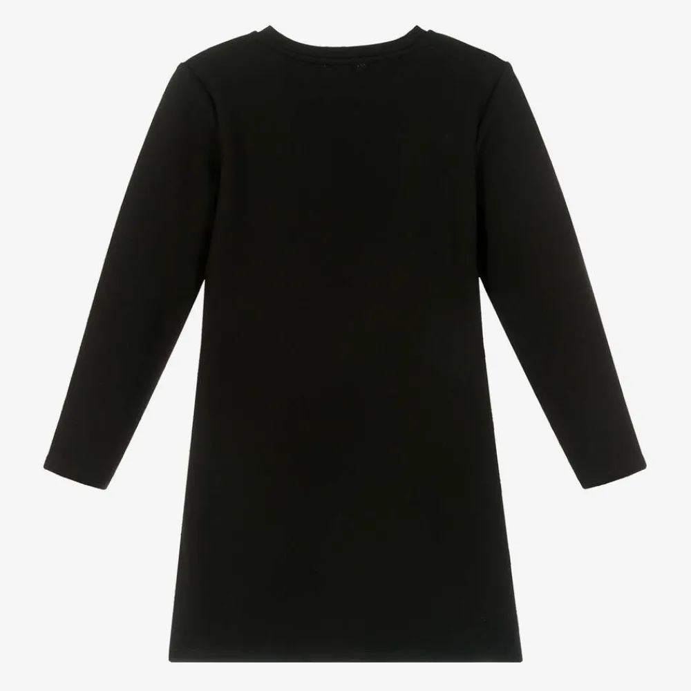 Black dress for girls by Sonia Rykiel Paris, made in soft and mid-weight Milano jersey. This sweatshirt style dress has long sleeves and a round neckline to balance style with comfort. The designer's name can be seen on the front in multicoloured diamantés, matching the sparkly trims on each shoulder.