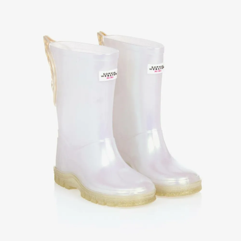 Pearlescent white rain boots for girls by British brand Sophia Webster Mini. They have the designer's signature butterfly wings on the back, in ivory with glittery gold detailing. Smooth and flexible, they have ridged glittery soles for good grip and a comfortable fabric lining. A rubberised logo tab can be seen on the front.