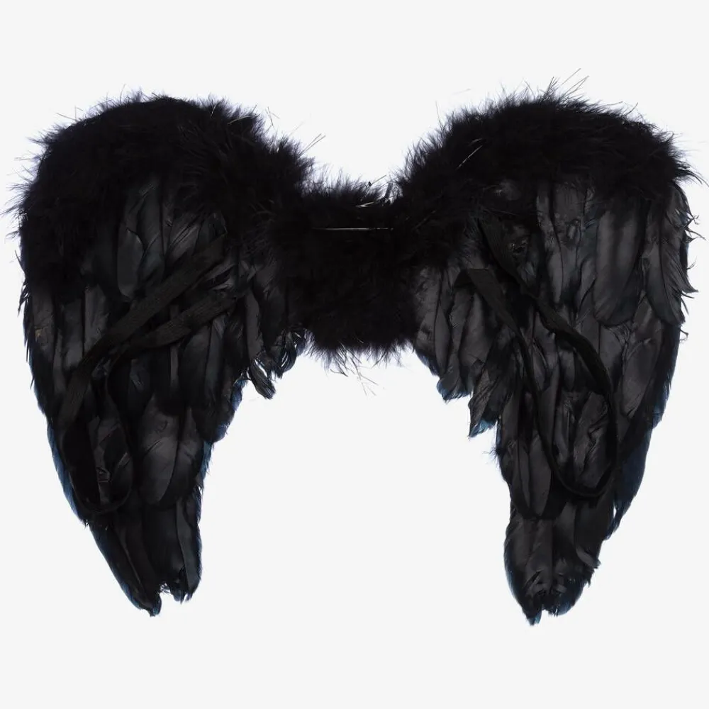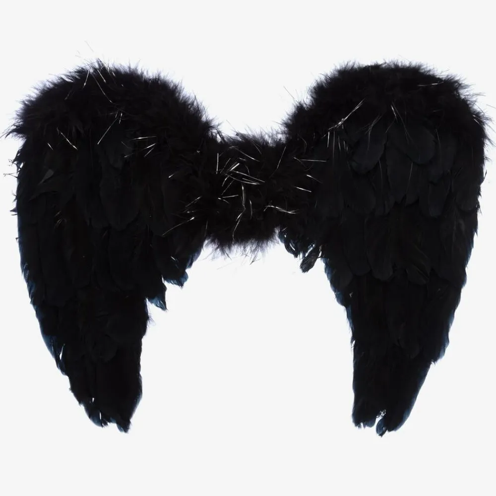 Black feather wings for boys and girls by Souza. These firm wings have a cardboard base, decorated with layers of silky black feathers and silver sparkly strands across the top. There are elasticated straps for a comfortable fit over the shoulders.