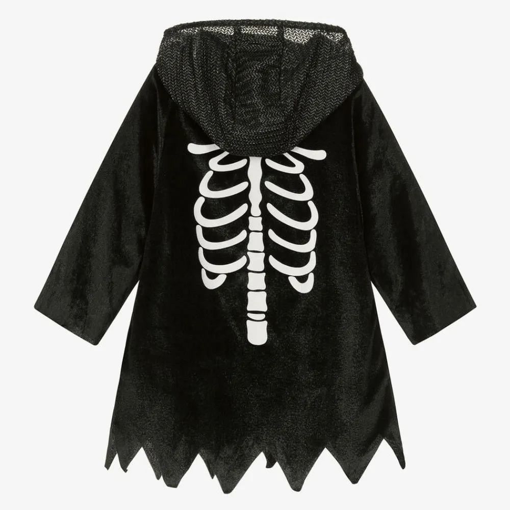 Fun black velvet dressing-up cape for boys and girls from Souza. It has a sheer mesh hood, with bones printed in white on the back and arms for added character. The front fastens with easy-to-use velcro and there is a metallic silver skull patch on the chest.