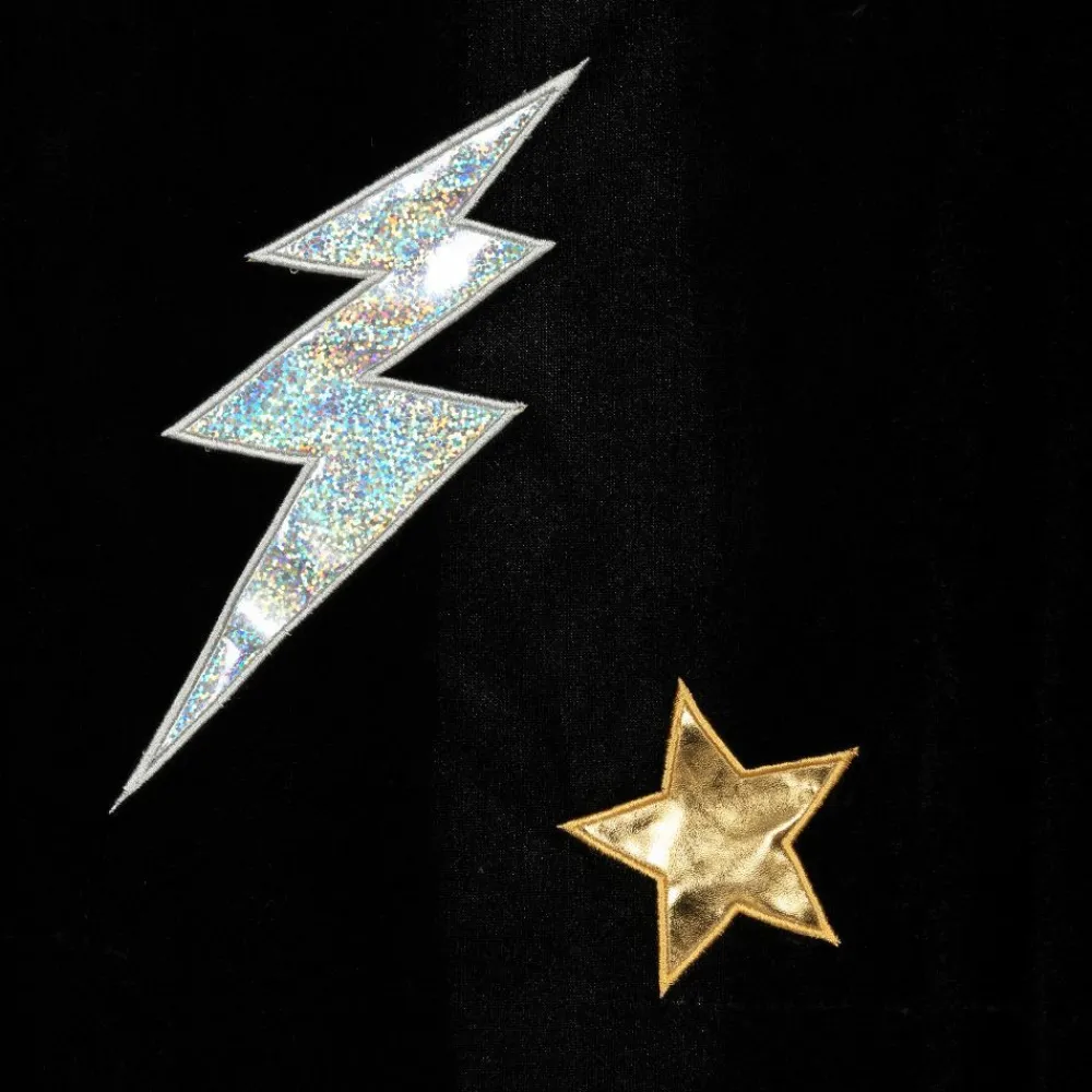 A super hero dressing-up cape for boys and girls by Souza, made in black velour with a super shiny silver lurex lining. So much fun for an imaginative play, it is decorated with colourful metallic appliqué in star and lightning shapes. It secures with a velcro tab on the front of the neck.