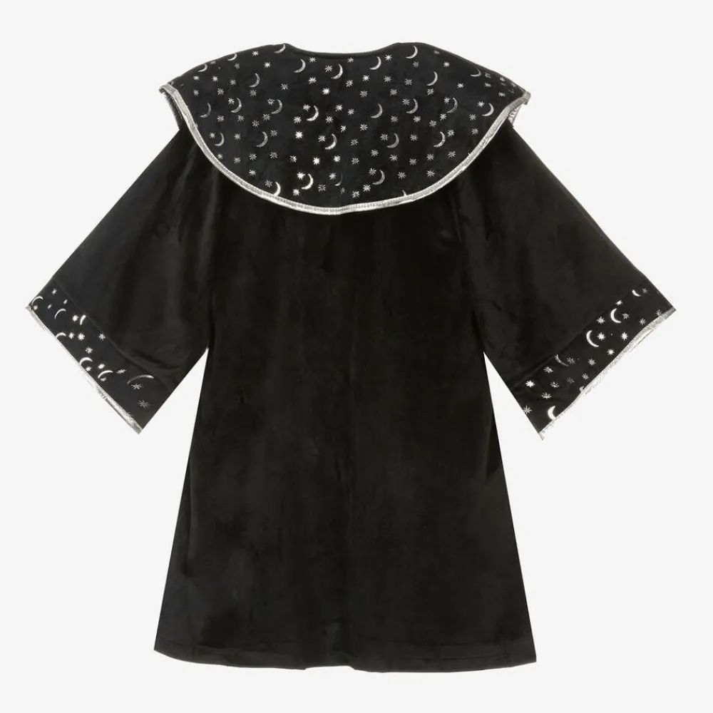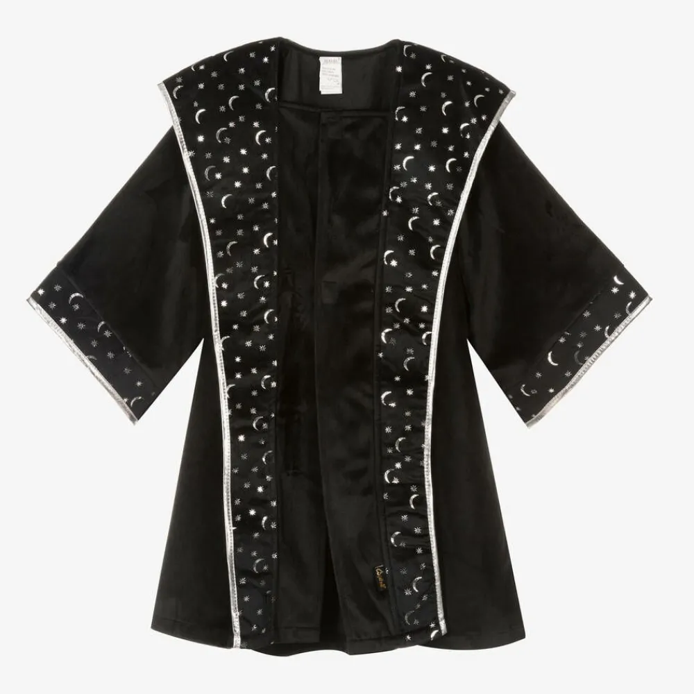 Black velvet wizard costume for boys and girls by Souza, with enchanting silver moon and star prints. Finished with silver trims, it fastens easily with velcro tabs on the front. Little wizards and witches will love waving their wands, saying 'hocus pocus' in this lovely costume.