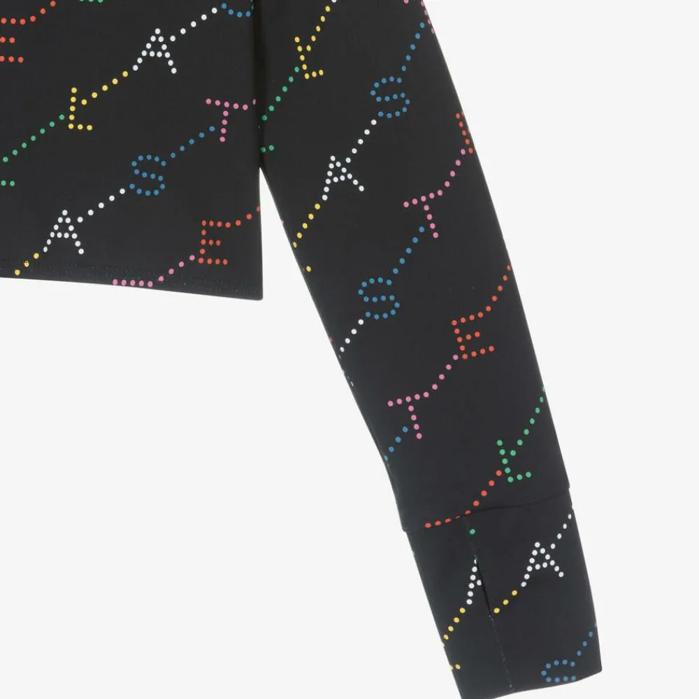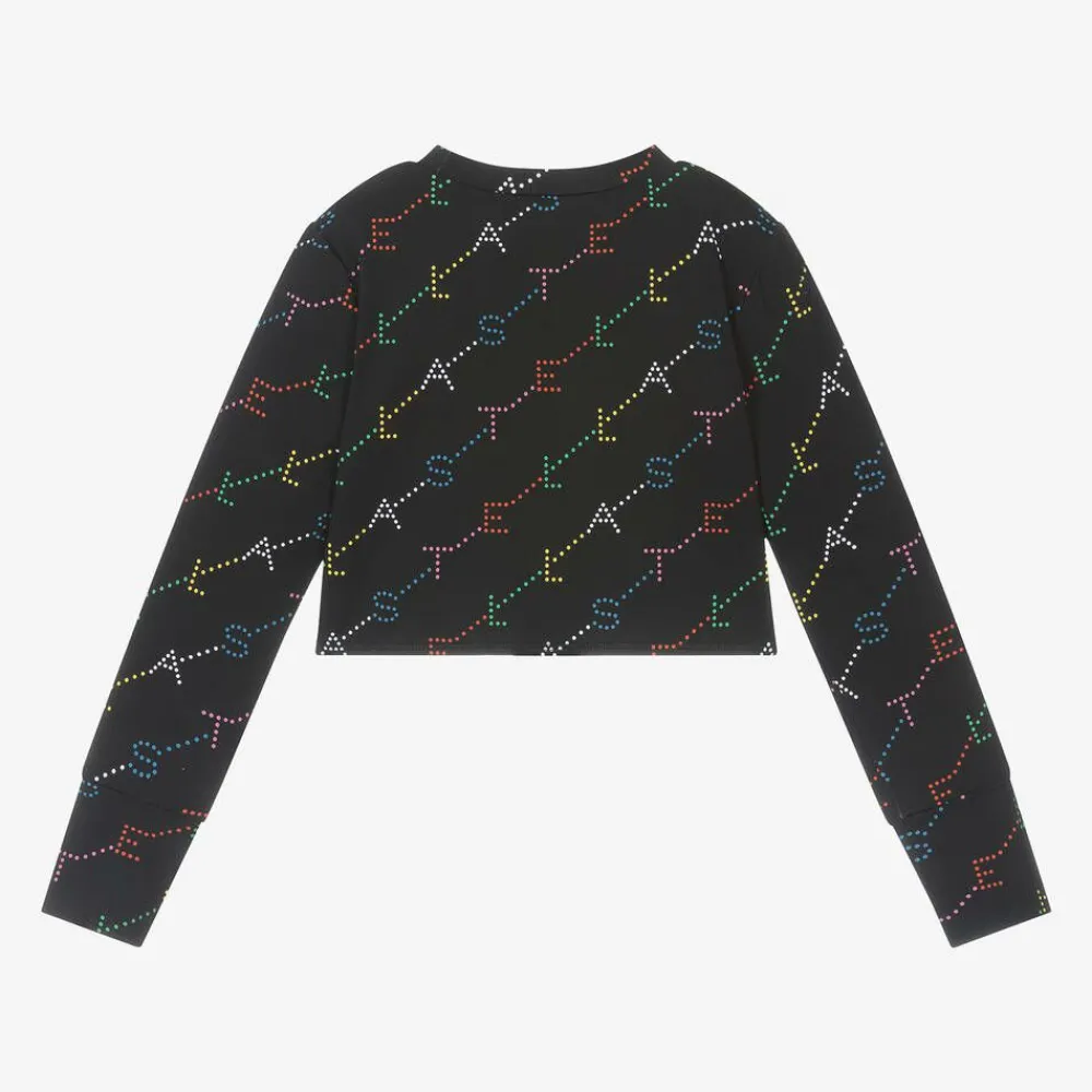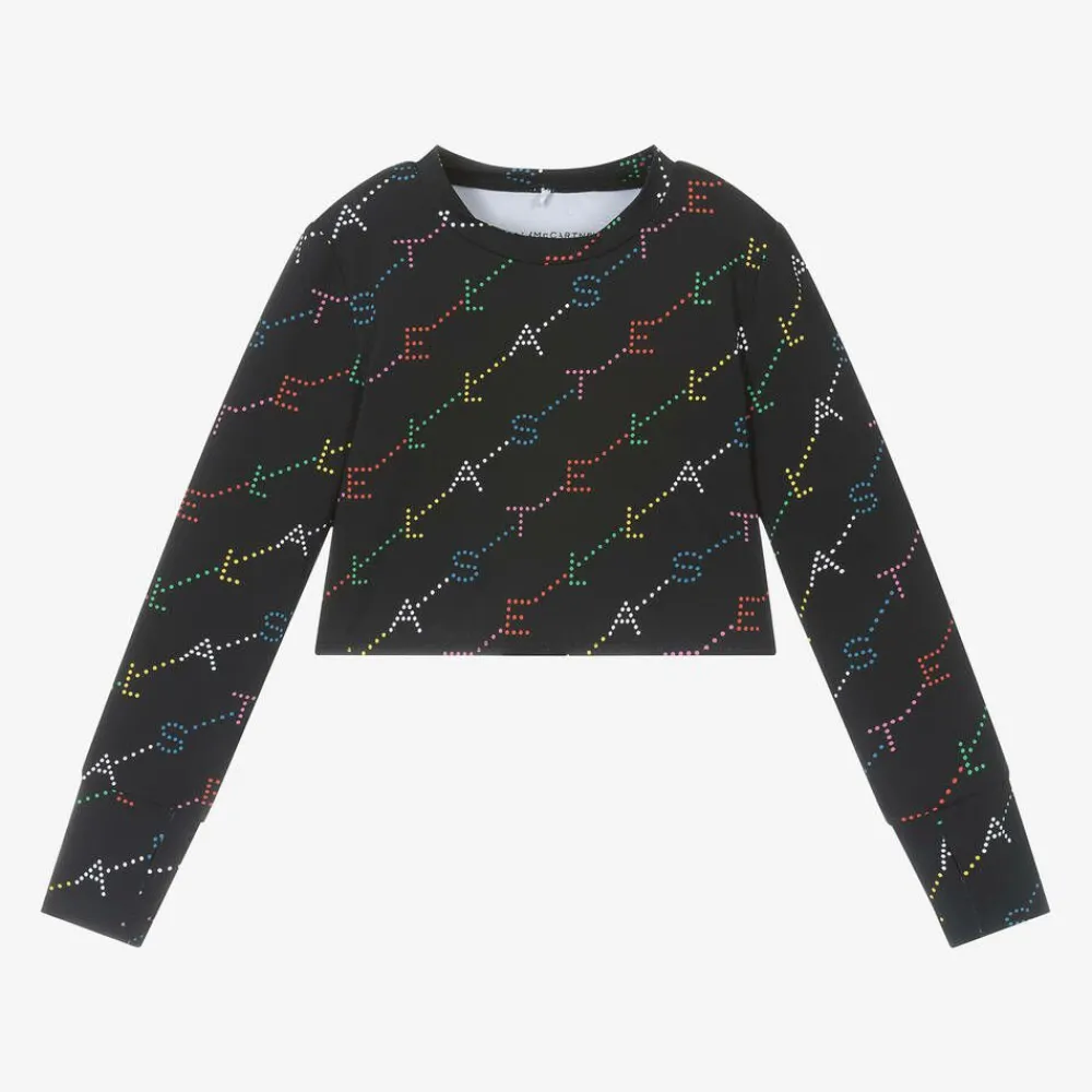 Black UPF50+ top for girls by British brand Stella McCartney Kids, with a colourful logo design. This sporty, cropped style is made in silky smooth and stretchy recycled fabric for comfortable wear and is designed with useful thumbholes on the cuffs. The Stella McCartney fit can be quite small so choose a size up if you want room to grow.