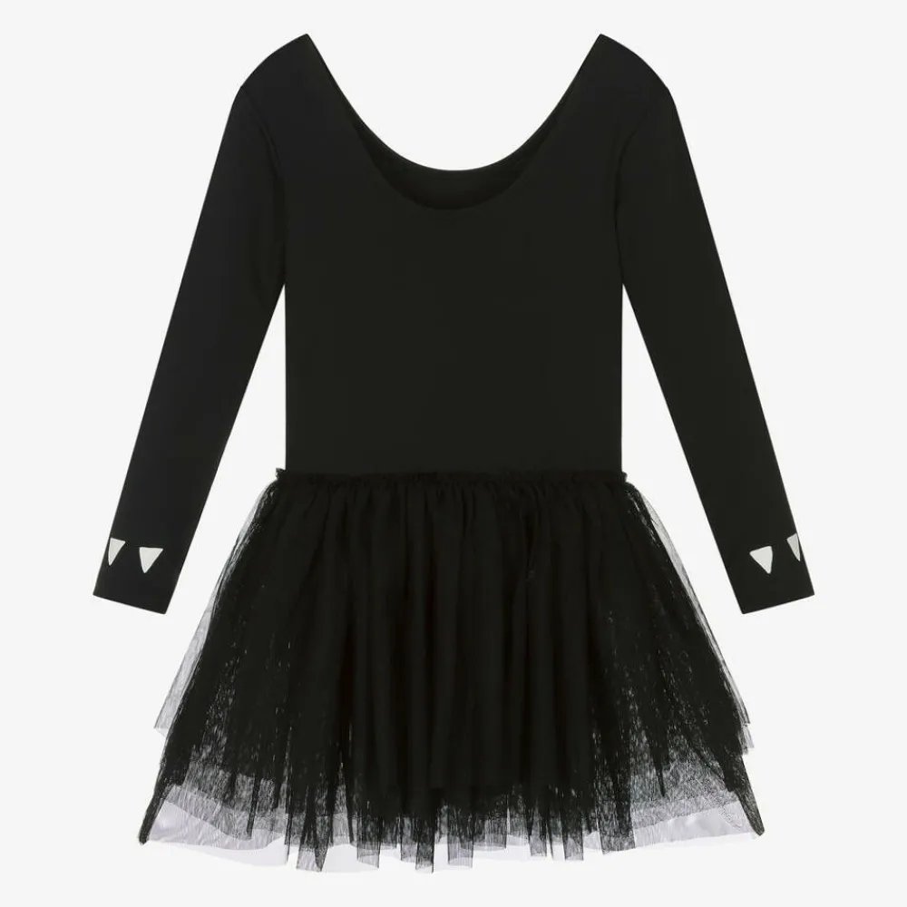Cute black cat costume for girls by Stella McCartney Kids, ideal for dressing up. Part of the Halloween collection, this silky smooth and stretchy, long-sleeved leotard has a fun and colourful cat face printed on the front and long sleeves with white 'claws' on the cuffs. For a sweet finish, it has a pretty tutu skirt made of layers of super soft tulle. Easy to wear, it simply pulls on. The Stella McCartney fit can be quite small so choose a size up if you want room to grow.