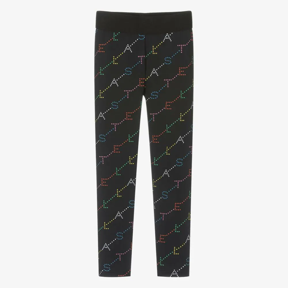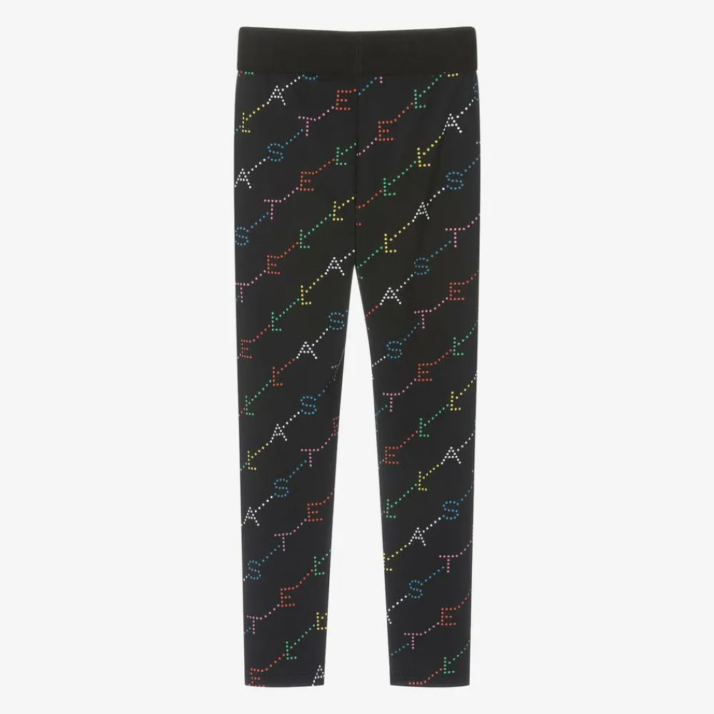 Black leggings for girls by Stella McCartney Kids with a colourful, diagonal logo design for instant designer appeal. Silky and stretchy, this sporty style is made from recycled material, ideal for casual, comfortable wear. The Stella McCartney fit can be quite small so choose a size up if you want room to grow.
