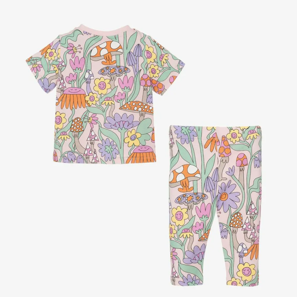 Younger girls soft pink legging set by Stella McCartney Kids, with a gorgeous fairy garden design. This comfortable little outfit is made from soft organic cotton jersey for a more sustainable choice and has popper fastenings on one shoulder, ideal for dressing little ones.