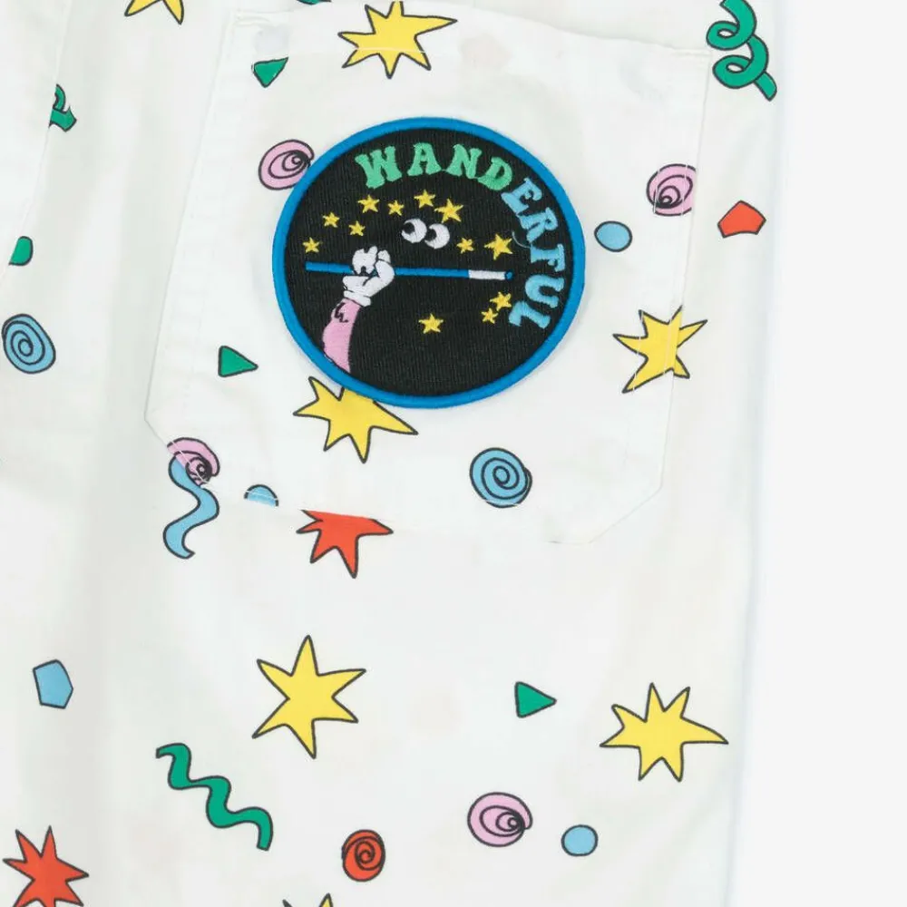 Ivory organic cotton shorts for boys by Stella McCartney Kids, with a fun and colourful printed pattern. They have an adjustable waist for an ideal fit, with a hook and button fastening. There are front and back pockets, with a magic-themed patch and signature logo tab to finish.