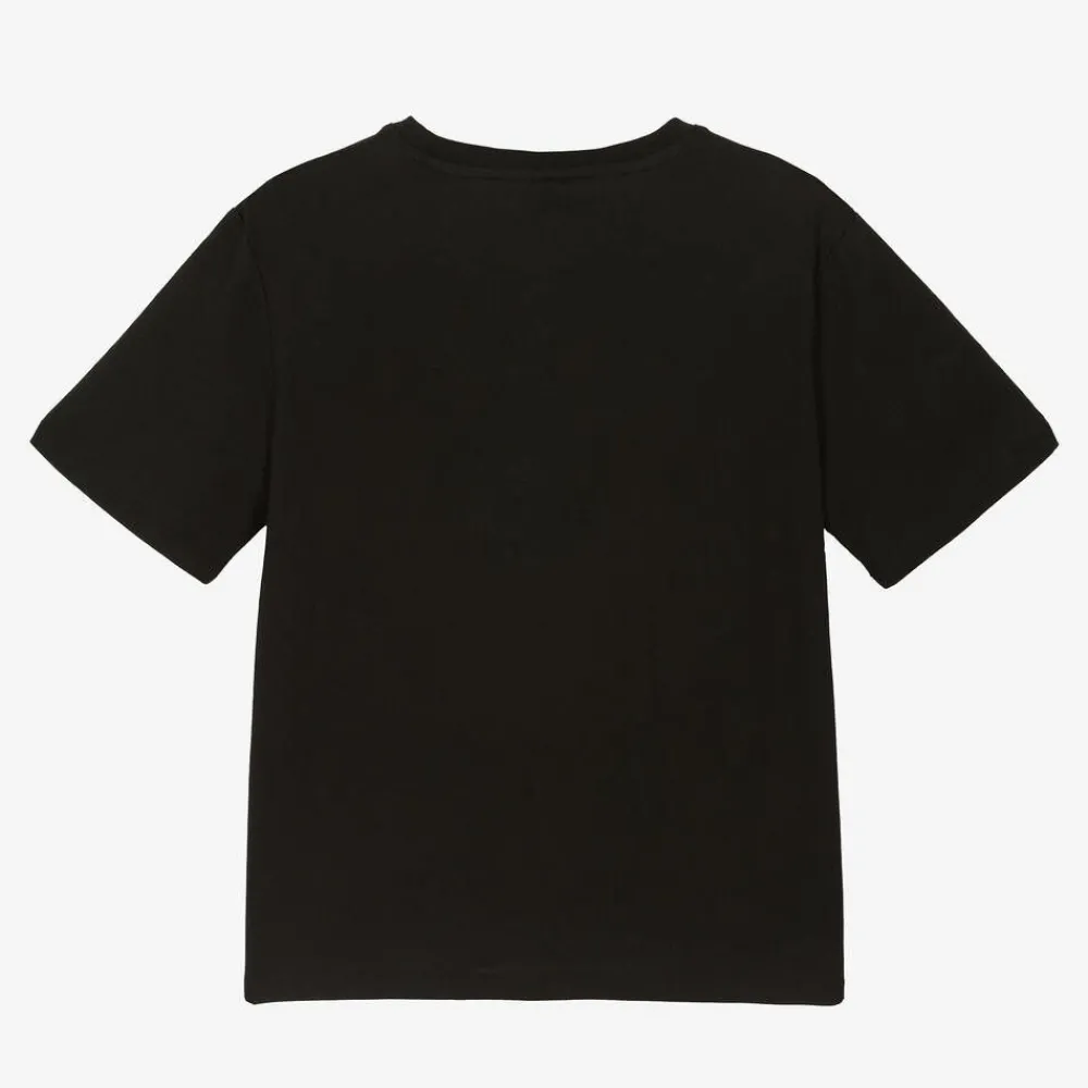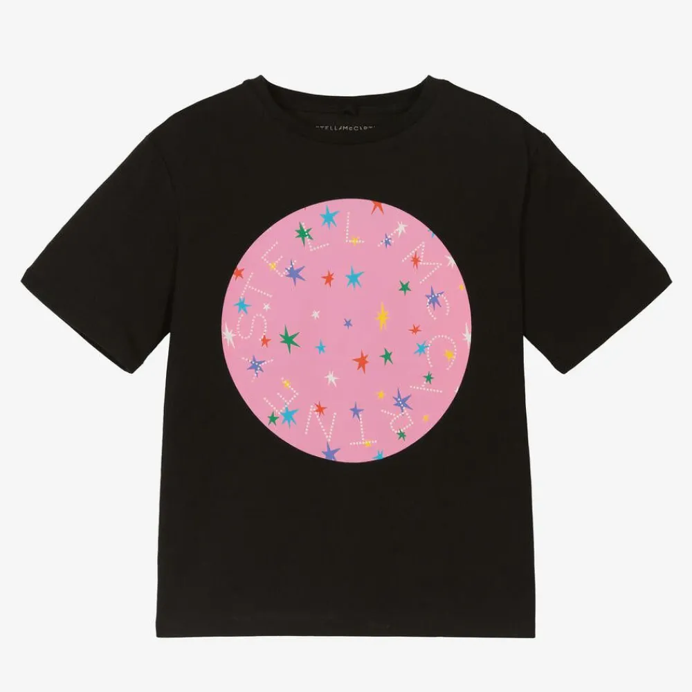 From British brand Stella McCartney Kids, a black organic cotton T-shirt for girls. Made in soft jersey, this comfortable tee features the brand's pink medallion logo print patterned with colourful stars for a standout look. The Stella McCartney fit can be quite small so choose a size up if you want room to grow.