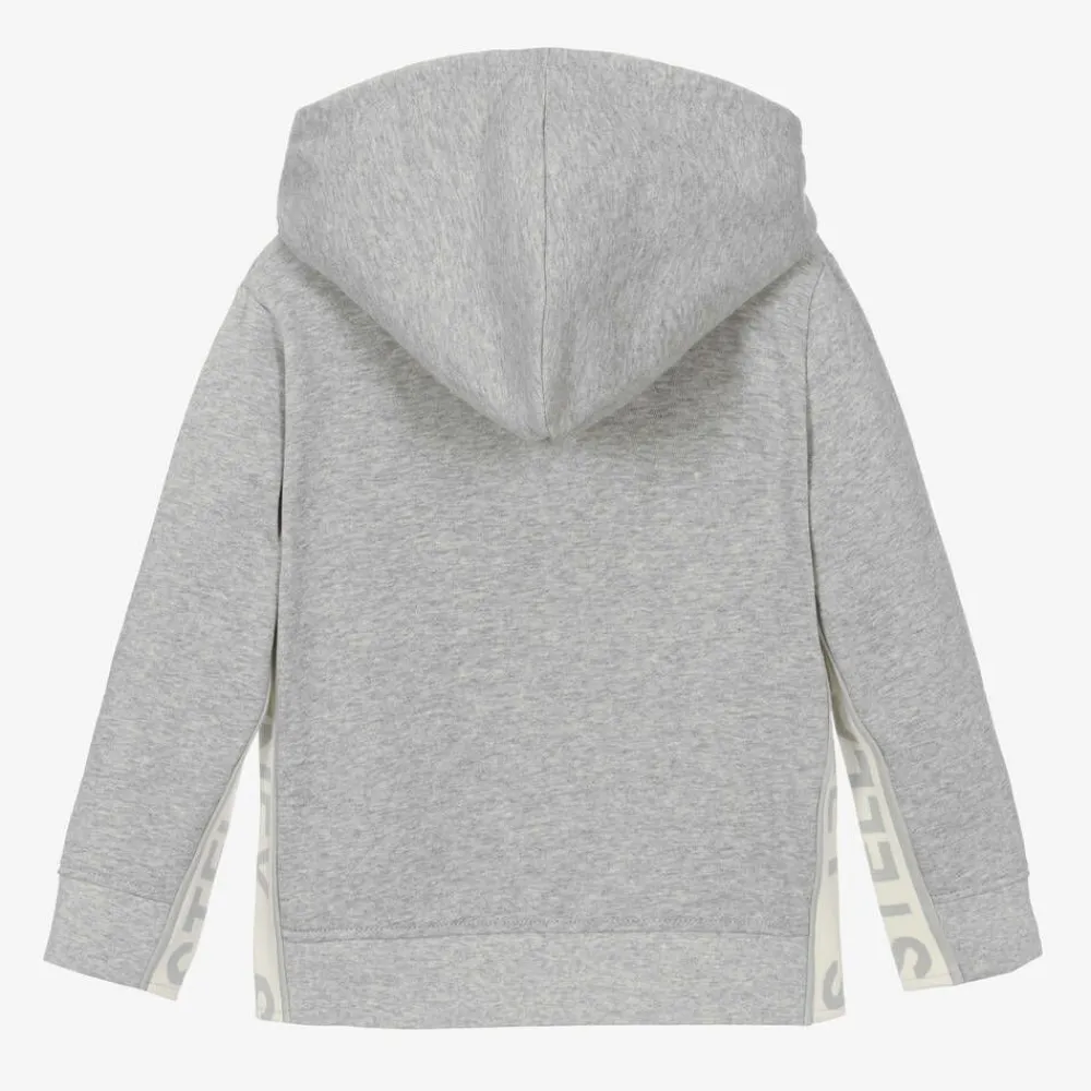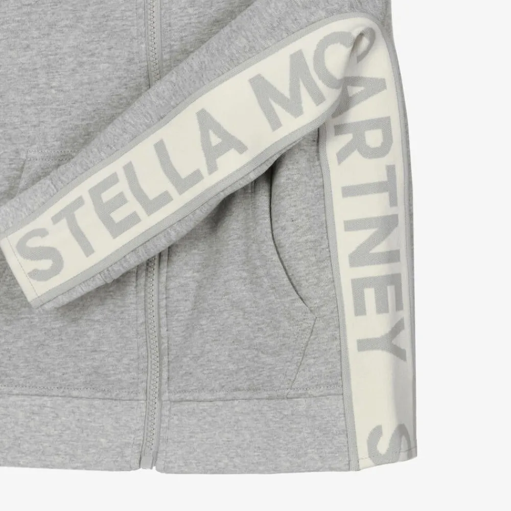 Grey marl organic cotton zip-up top for boys and girls by Stella McCartney Kids, made in soft, comfortable, mid-weight jersey. The British label has styled this hoodie with jacquard logo tape on the long sleeves and sides in complementary ivory and grey. Zipping up on the front, it has handy pockets and a fleece-feel interior to add cosiness. The Stella McCartney fit can be quite small so choose a size up if you want room to grow.