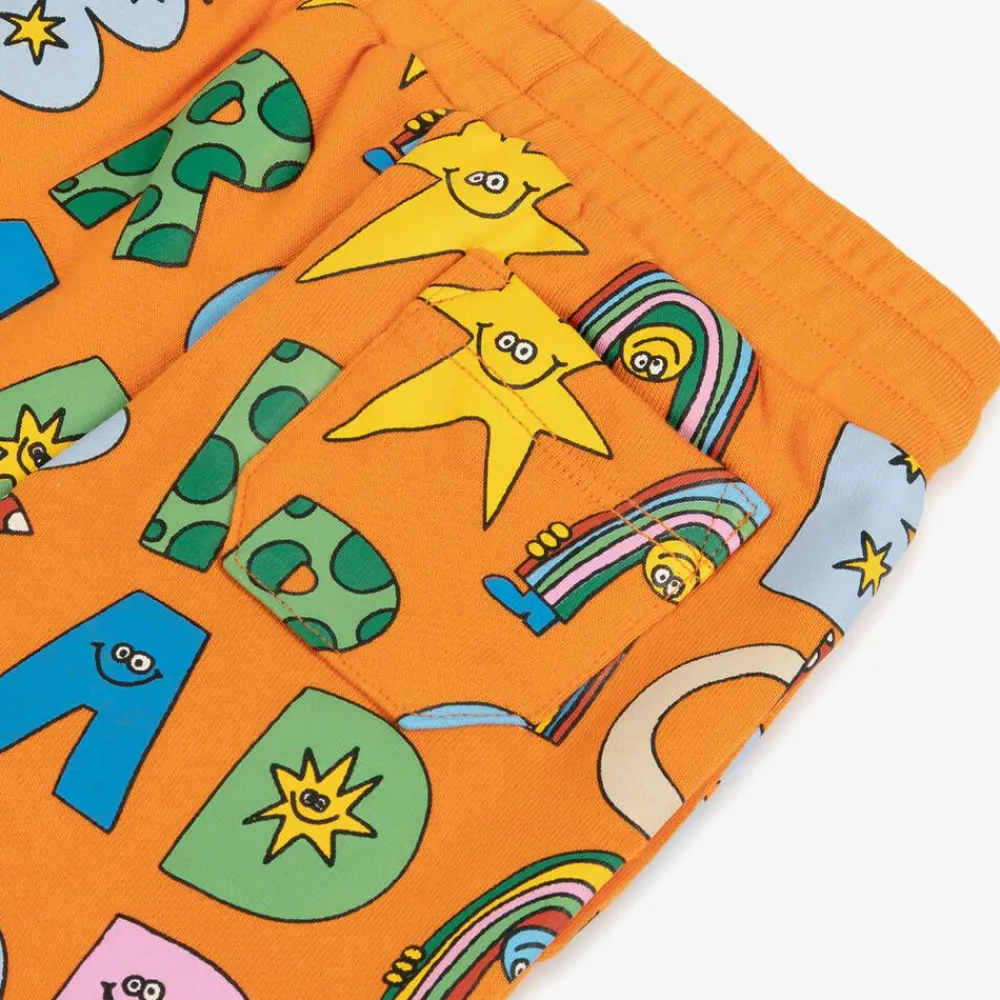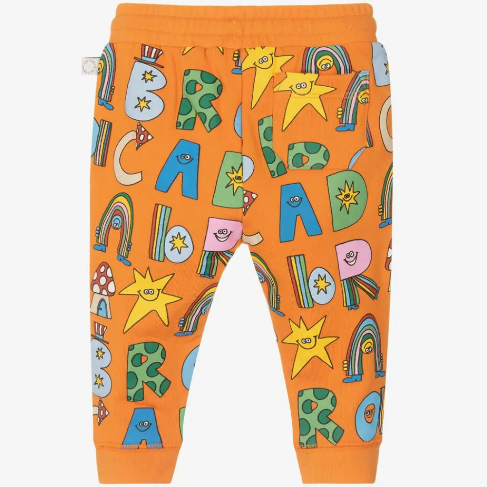 Younger boys bright orange joggers by Stella McCartney Kids, with a vibrant magical logo design. Super comfortable for little ones to wear, they are made of soft organic cotton and have a stretchy drawstring waistband, ideal for little tummies. There are also sweet side and back pockets to give them a more grown-up look.