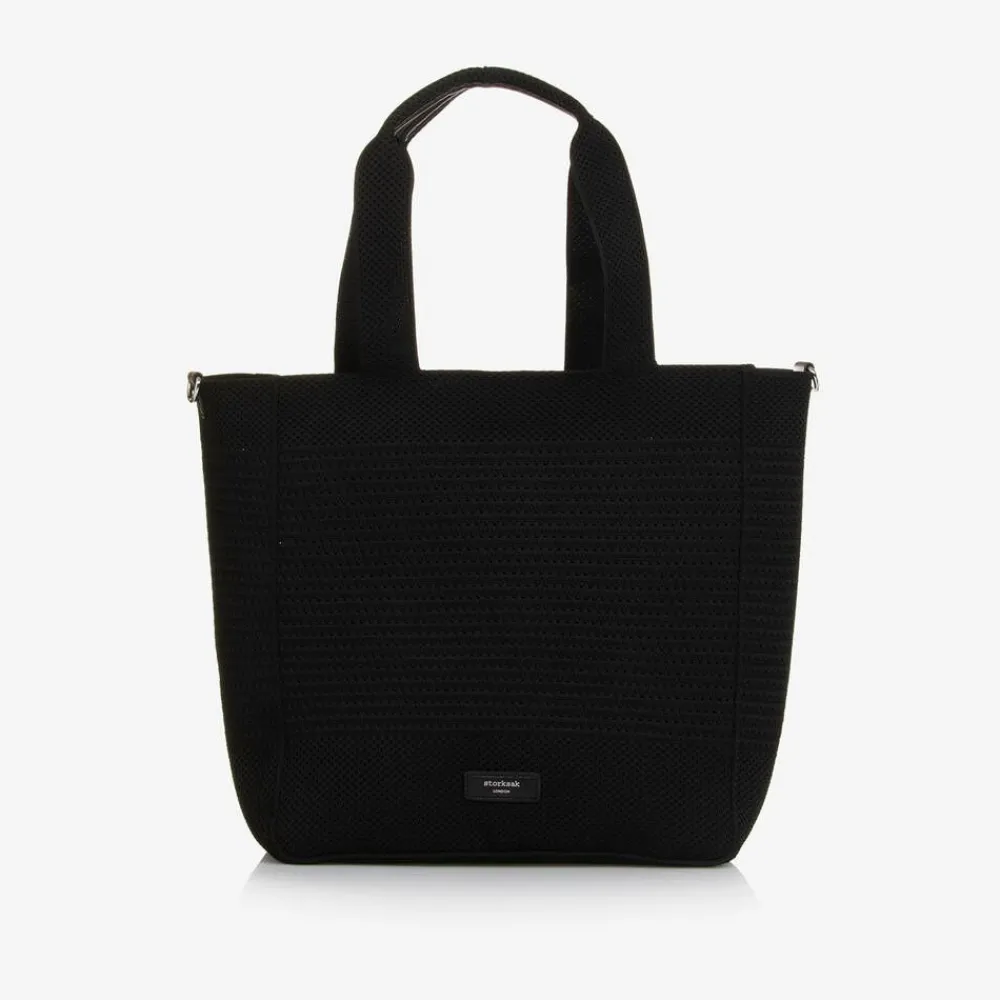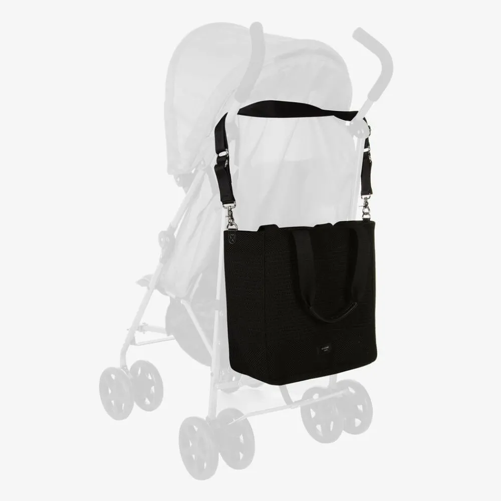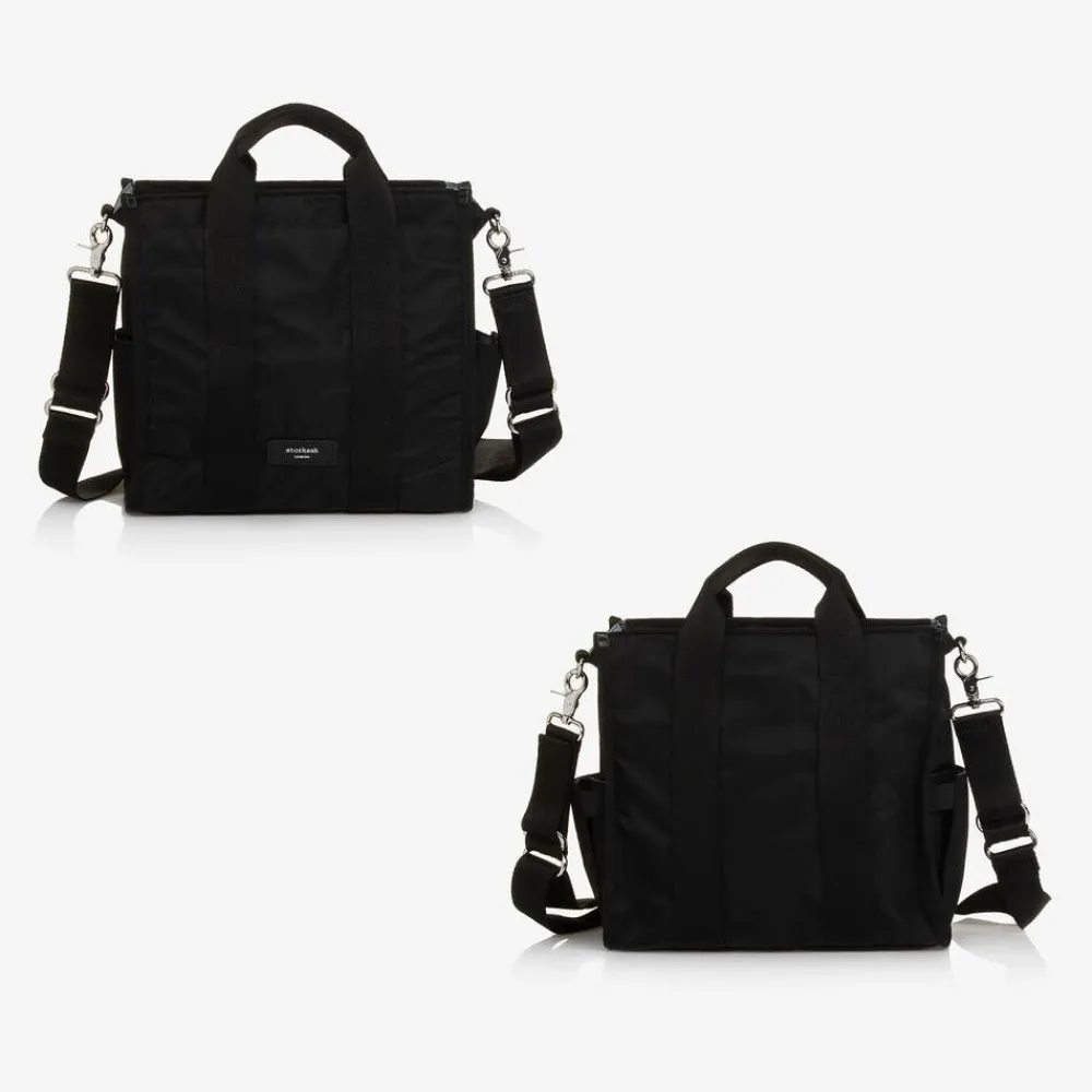 A versatile 2-in-1 black changing bag by Storksak. The large, open-top tote is made in an ultra-durable knit construction for a flexible, lightweight yet stylish look, with a detachable inner zip pocket. Fits easily into the tote, the compact organiser bag has six useful pockets for baby's essentials on the go and a removable, insulated bottle pocket. Compatible for use with both bags, the detachable and adjustable shoulder strap can also hook onto a stroller with the velcro tabs. A washable, padded changing mat with side pockets and a practical carry is included.