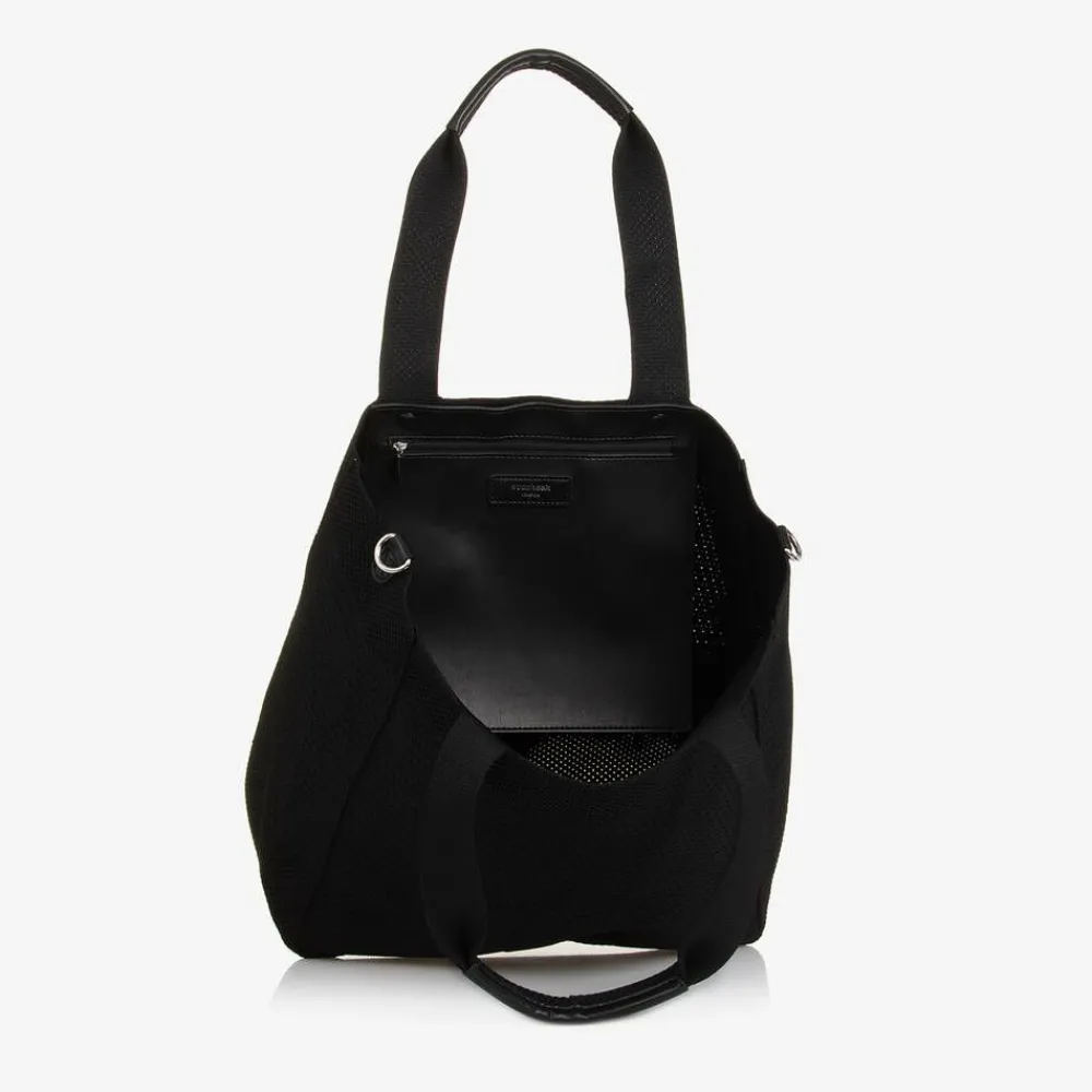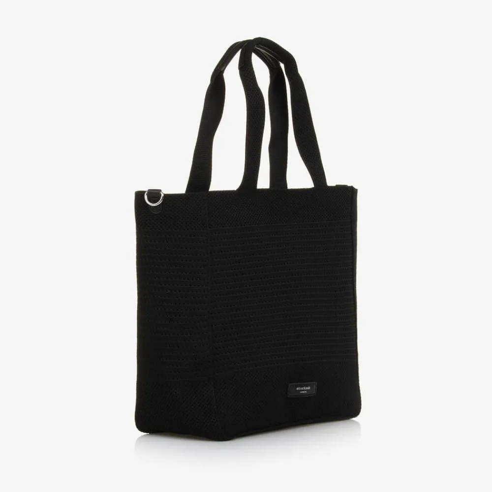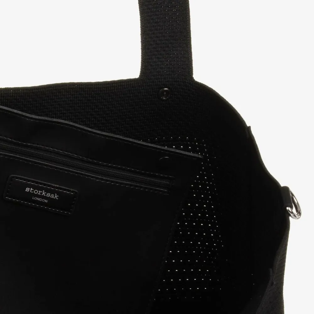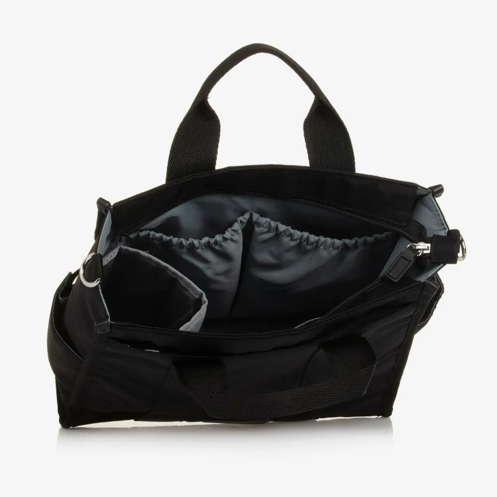 A versatile 2-in-1 black changing bag by Storksak. The large, open-top tote is made in an ultra-durable knit construction for a flexible, lightweight yet stylish look, with a detachable inner zip pocket. Fits easily into the tote, the compact organiser bag has six useful pockets for baby's essentials on the go and a removable, insulated bottle pocket. Compatible for use with both bags, the detachable and adjustable shoulder strap can also hook onto a stroller with the velcro tabs. A washable, padded changing mat with side pockets and a practical carry is included.