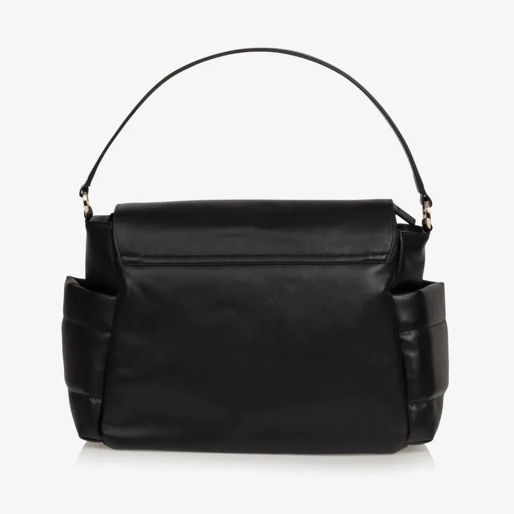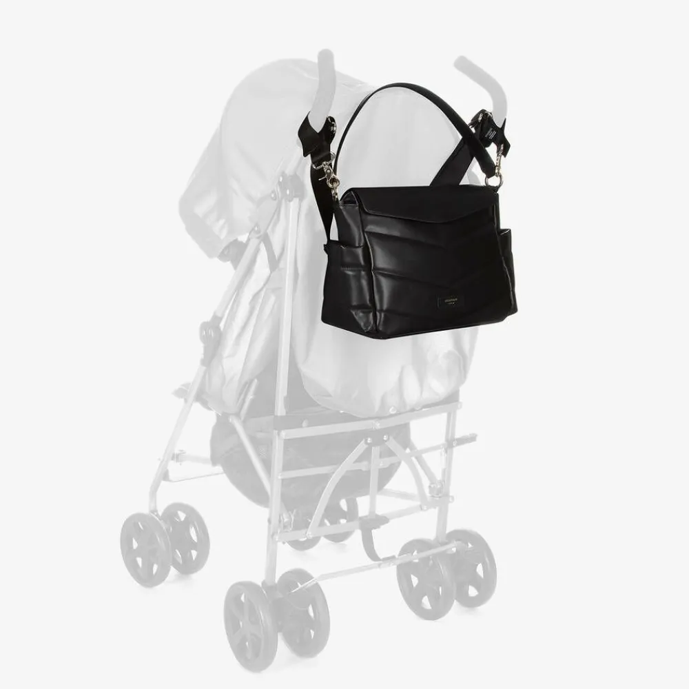 A stylish black leather changing bag by Storksak, with a beautiful smooth feel and quilted detailing. Branded on the front, this versatile design has a spacious compartment with a zip opening and a magnetic flap cover. The lined interior features two elasticated pockets and an insulated sleeve that secures inside with velcro. There are two side pockets for bottles and a discreet zip pocket on the front for storing valuables. This sleek design is styled with a leather shoulder strap and comes with a long detachable strap. This has convenient velcro stroller straps built in for practicality.