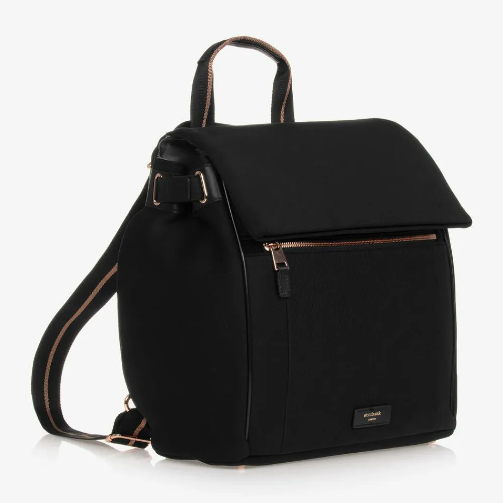 Black scuba changing bag by Storksak, with stylish rose gold details. The spacious main compartment fastens with a smooth zip, and contains elasticated and zip pouches for extra organisation. It comes with an easy-to-clean changing mat and useful bottle bag, each with velcro fastening carry straps. Included are a pair of clip-on stroller straps to attach to your buggy or pram. The adjustable shoulder straps have sparkly rose gold stripes, and are adjustable for a great fit. There is a zip fastening pouch on the front for small essentials. A rose gold embossed logo can be seen on the front, completing this practical accessory with a branded touch.