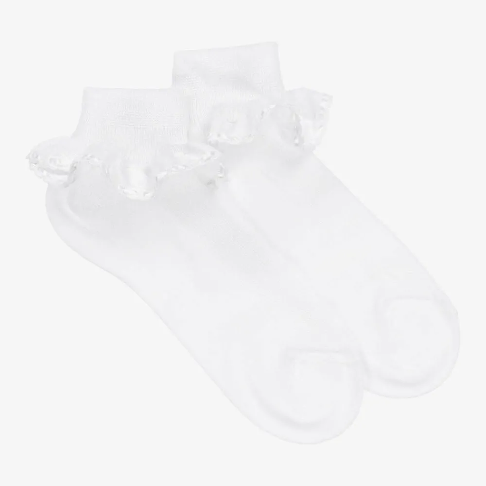 Girls white cotton socks with ribbon ruffles by Story Loris. Finely woven in soft cotton, these pretty socks have delicate organza and white ribbon ruffle trims at the ankles.