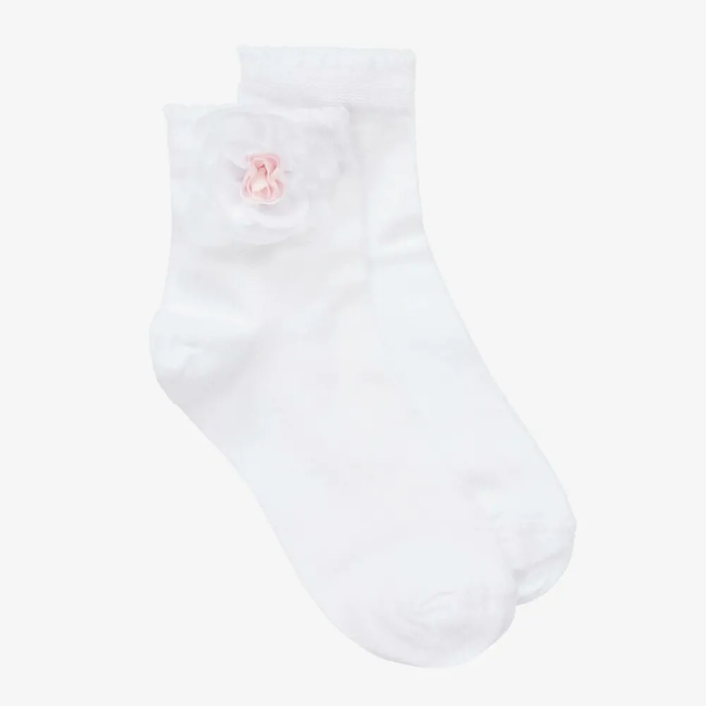 Little girls white socks by Story Loris. Finely knitted in a cotton blend, they are decorated with a floral appliqué on the sides and have a softly scalloped ankle cuff.