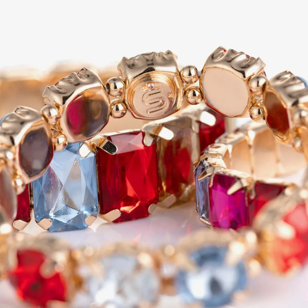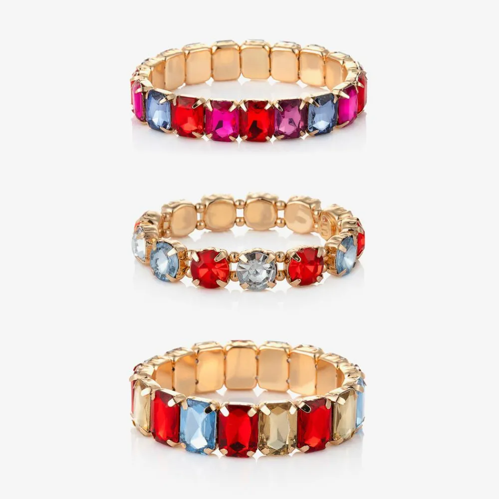 A pack of three bracelets for girls designed by Super Smalls, presented in their signature branded box. Each slightly different in style, they have sparkly faux gemstones in red, blue, pink, and purple mounted on gold-tone metal. They are elasticated for comfortable wear and are ideal for adding a touch of glamour to any outfit.