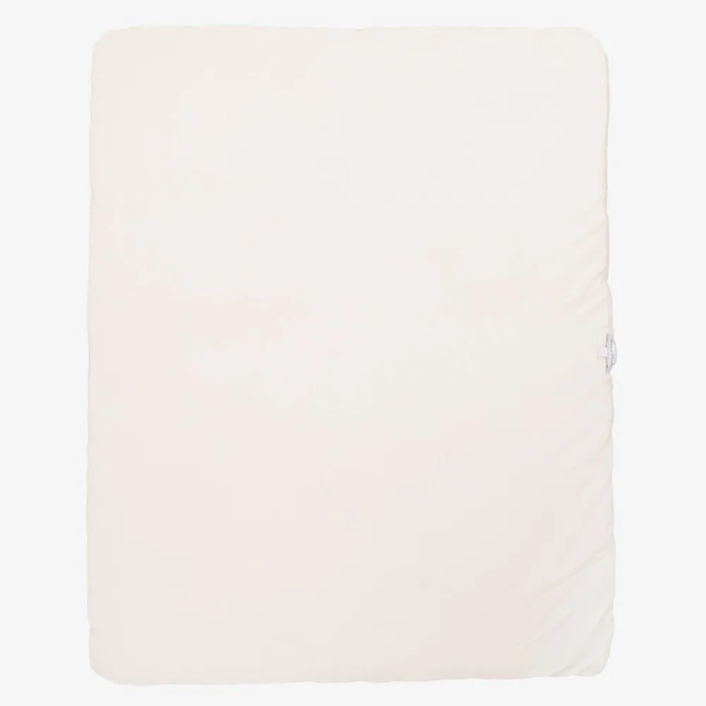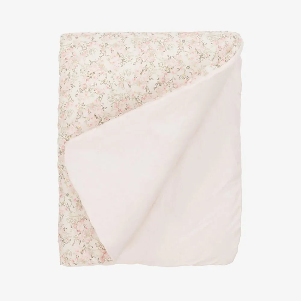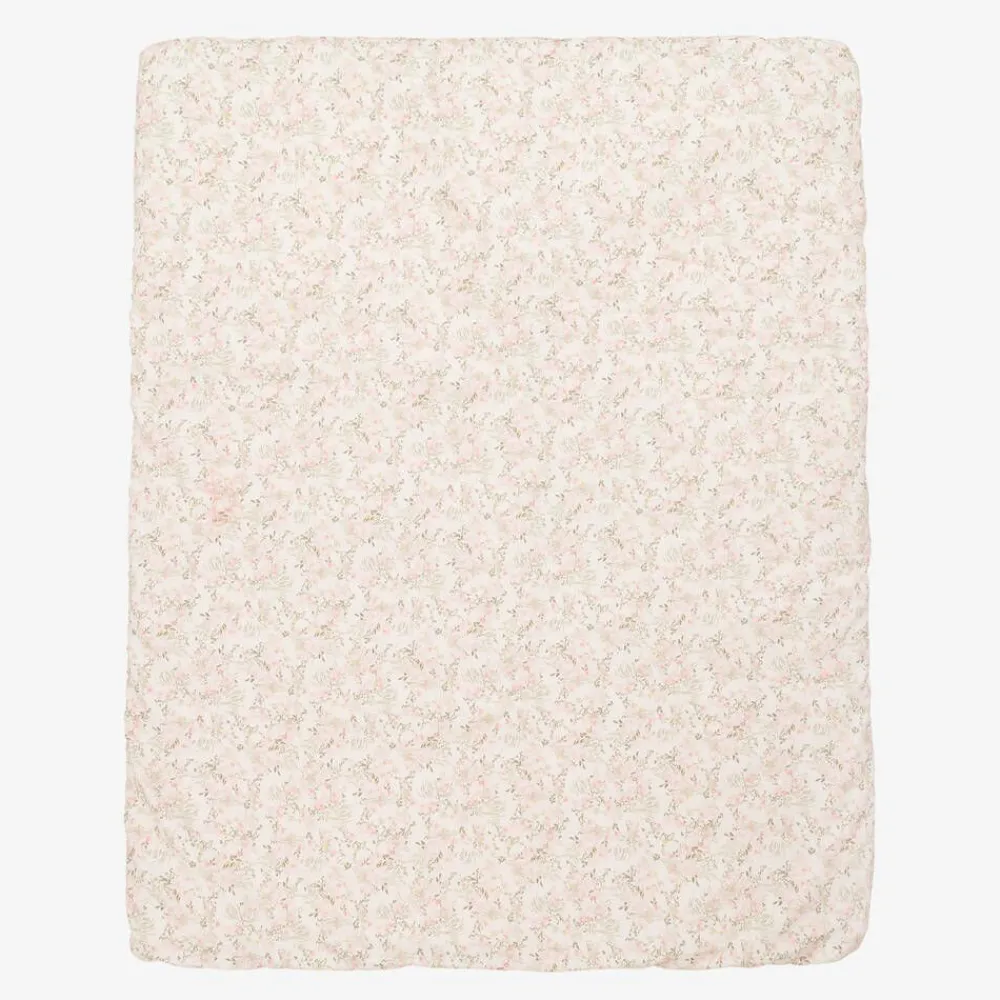 Lovely blanket for baby girls by Tartine et Chocolat. Made in softly ribbed cotton, the front is patterned with a pretty pink and green floral print on an ivory background, with a pink embroidered logo at the top. The plain pale pink reverse is made in soft cotton jersey. Warmly padded, this cosy blanket is ideal for use in the nursery and as a soft surface for baby to lie on.