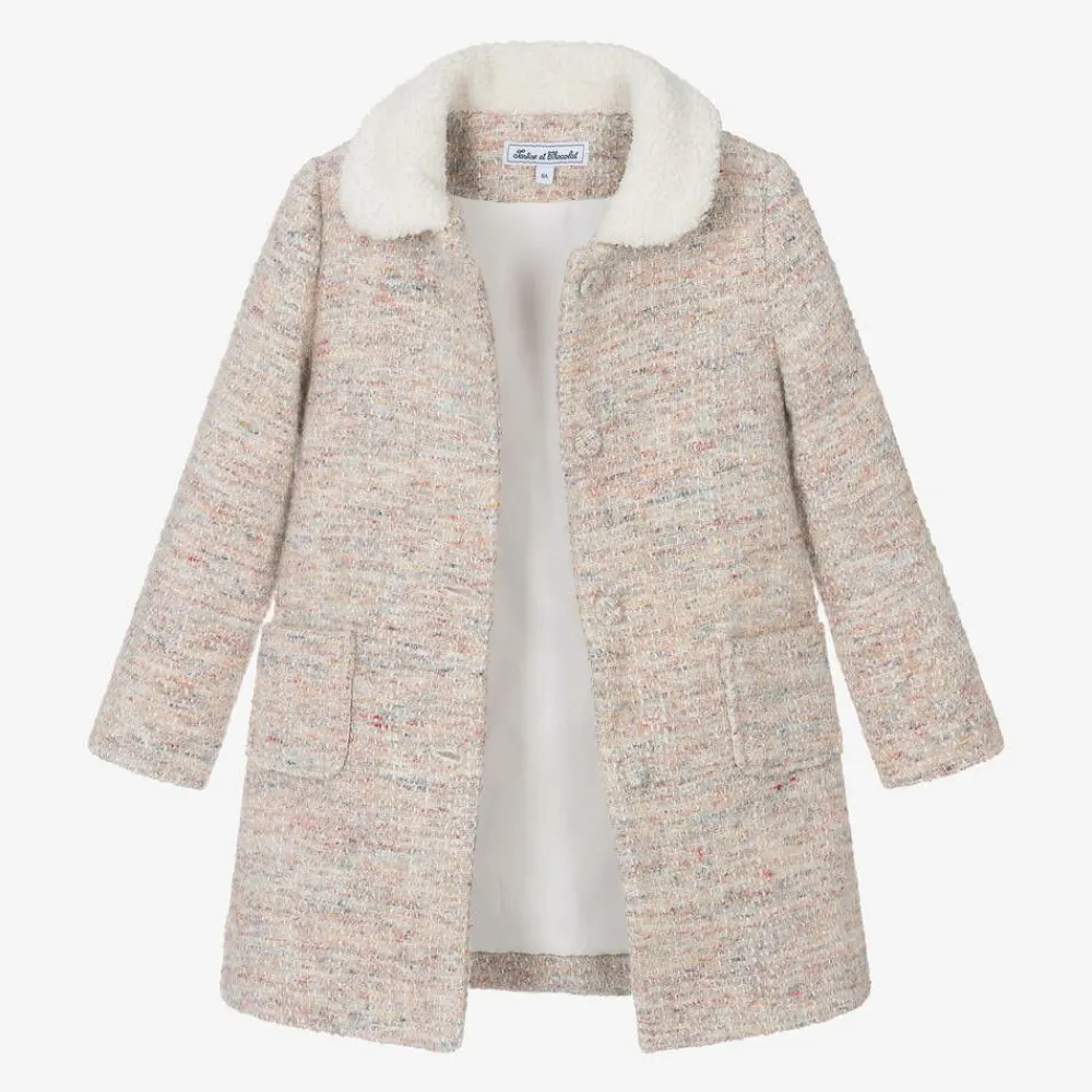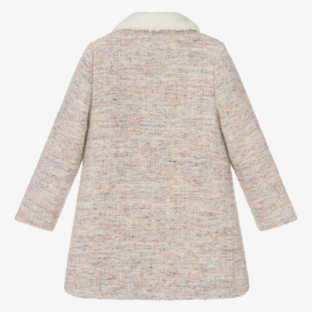 Elegant and stylish for girls, this beige and pink tweed coat is by French brand Tartine et Chocolat. It is made in a luxurious blend of wool, cotton and linen, with a contrasting ivory collar in soft sherpa fleece. Lined in silky satin for comfort, this smart coat fastens with fabric covered buttons down the front, and is trimmed with useful patch pockets.